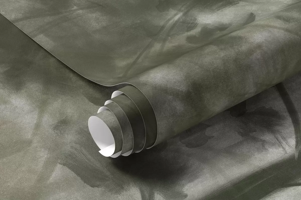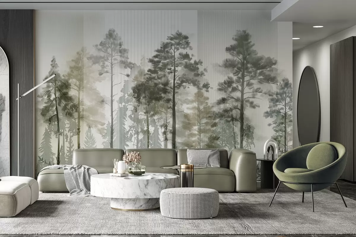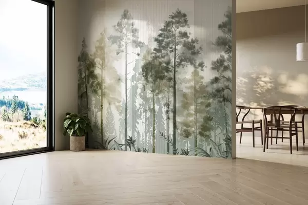 Тапете за зид Густа шума са високим боровима, бујним зеленим лишћем, магловитом атмосфером са текстурама вертикалних линија бр. w09163