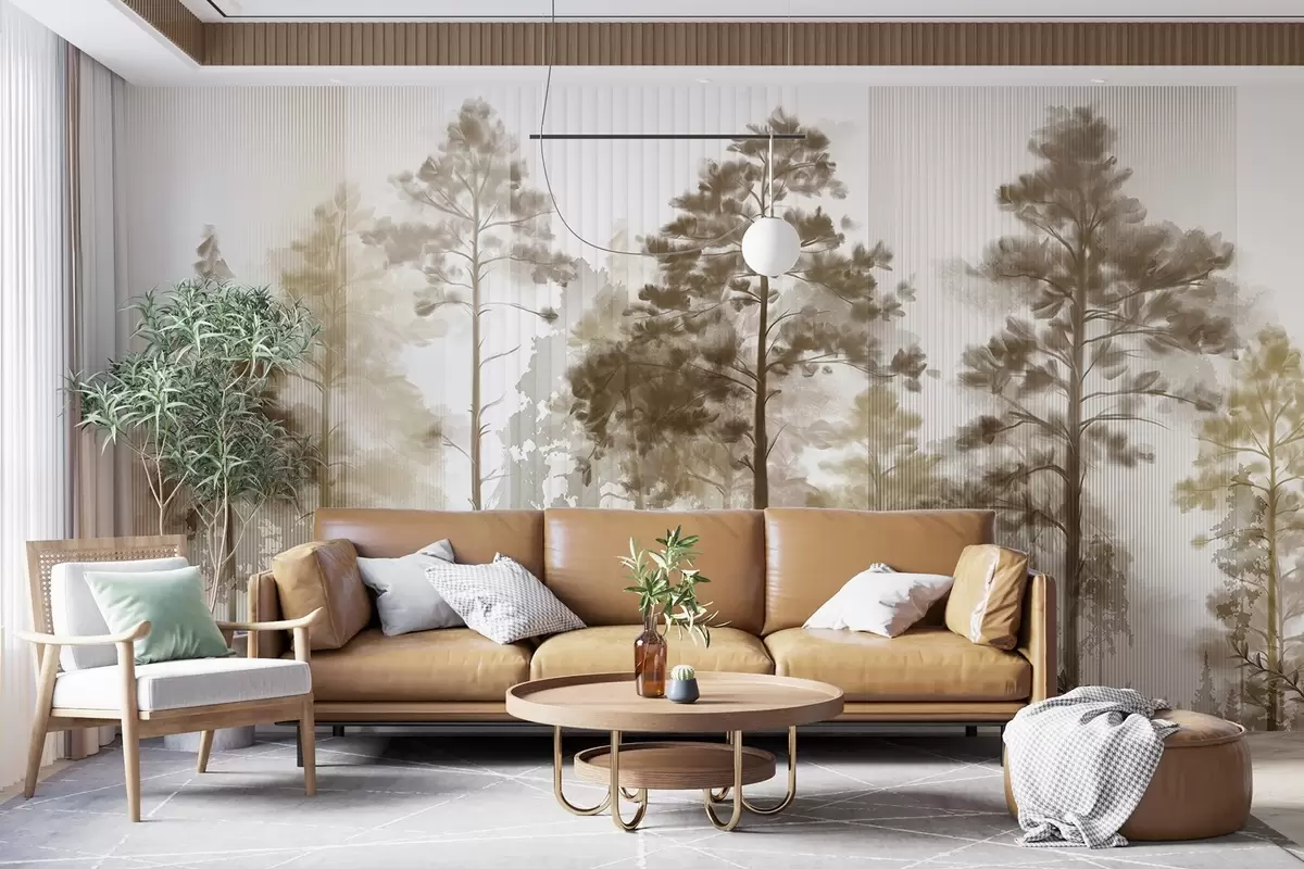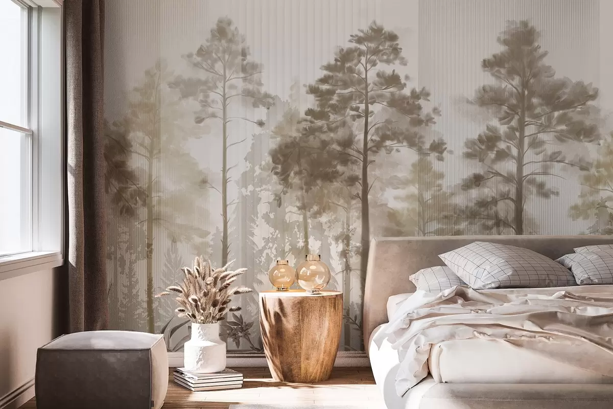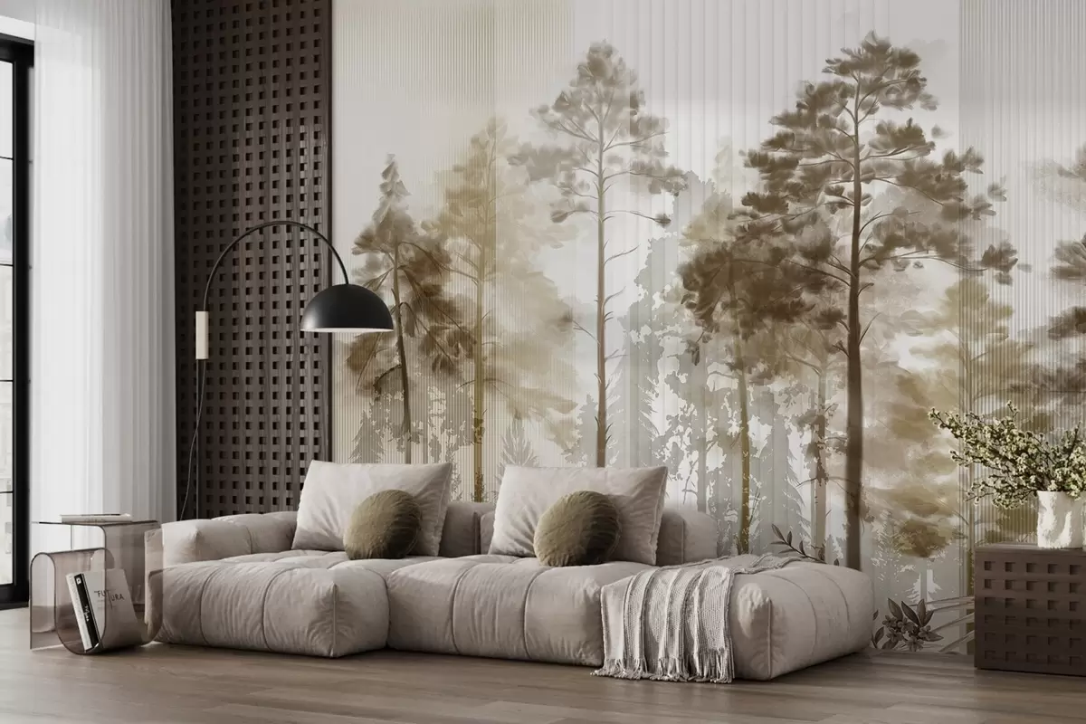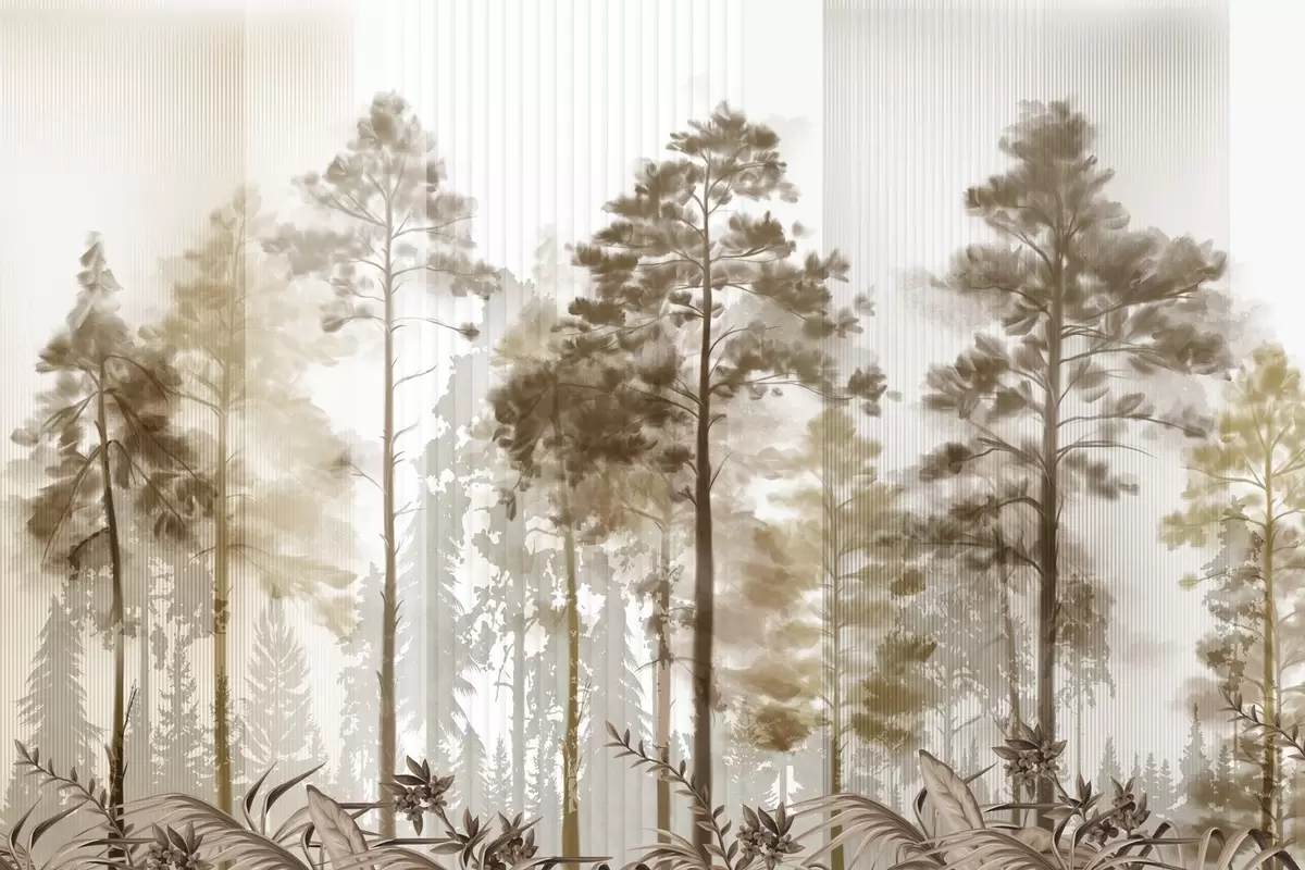 Тапете за зид Густа шума са високим боровима, бујним беж лишћем, магловитом атмосфером са текстурама вертикалних линија бр. w09163v1