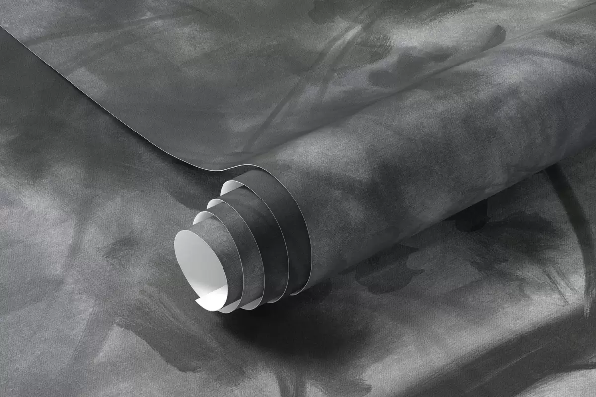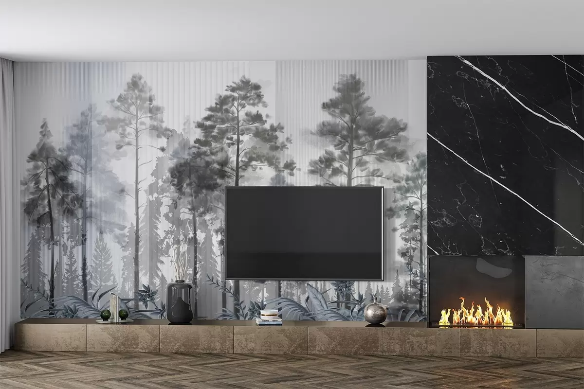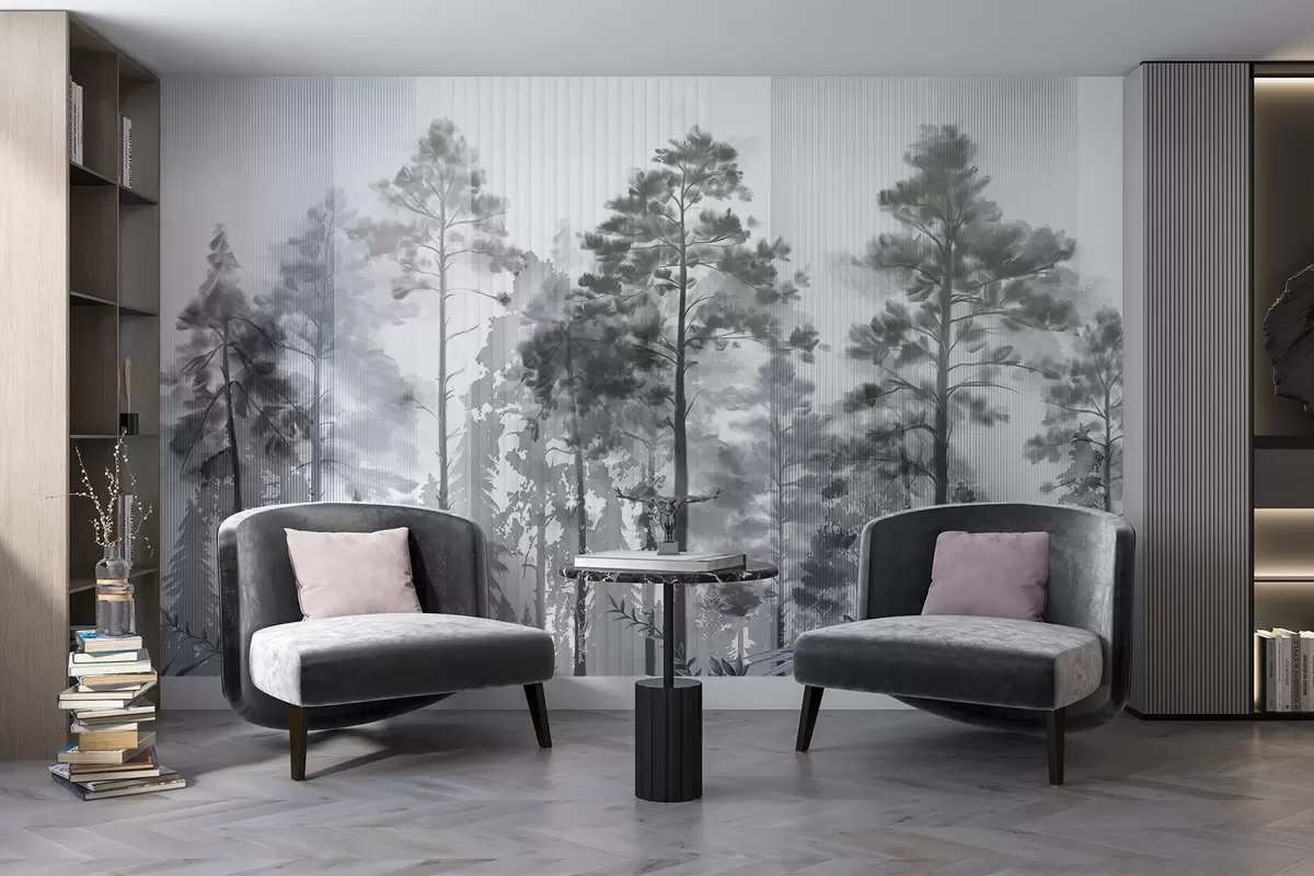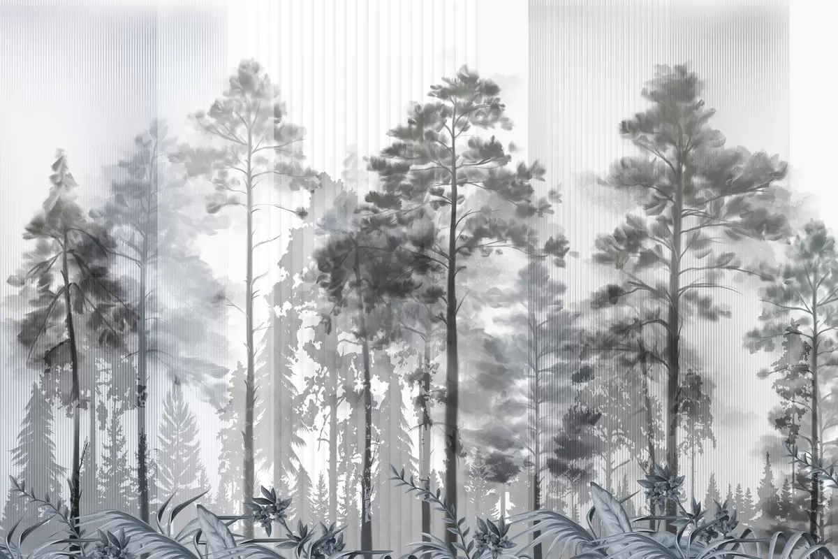 Тапете за зид Густа шума са високим боровима, бујним сивим лишћем, магловитом атмосфером са текстурама вертикалних линија бр. w09163v2
