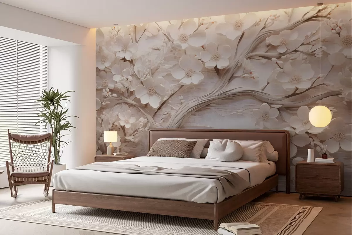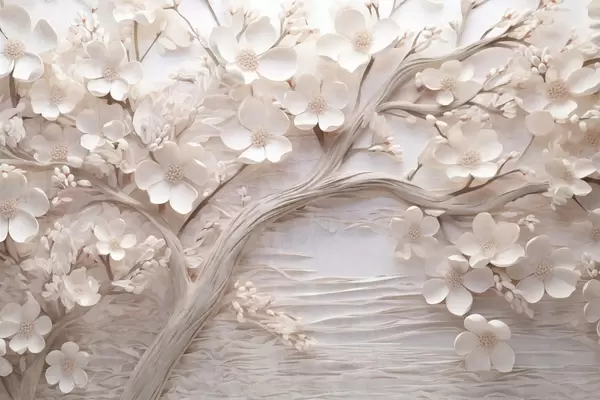 Тапете за зид Текстурирано дрво са белим цвећем и смеђим стаблом, позадина је бела са хоризонталним линијама, меко осветљење бр. w09166