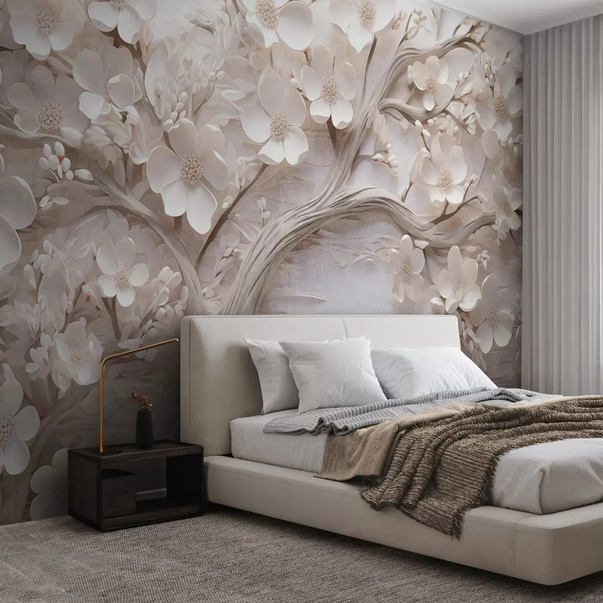 Тапете за зид Текстурирано дрво са белим цвећем и смеђим стаблом, позадина је бела са хоризонталним линијама, меко осветљење бр. w09166