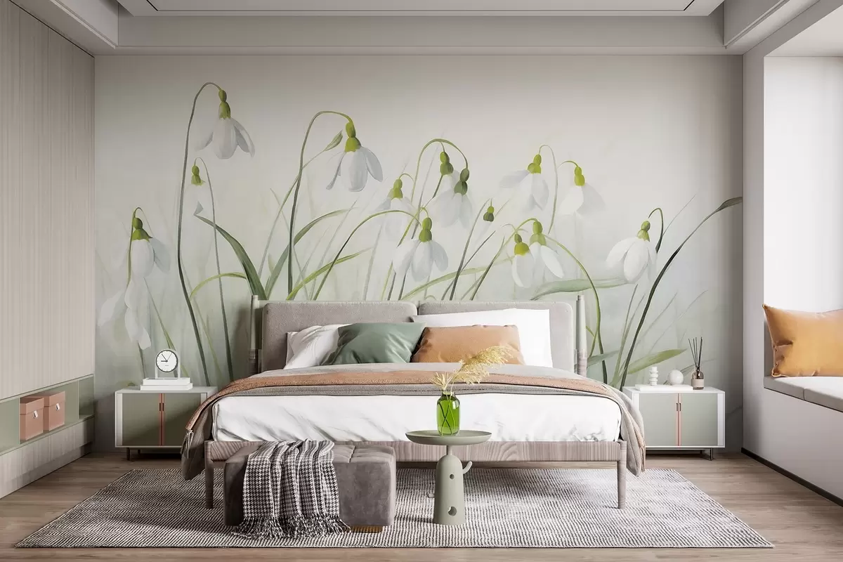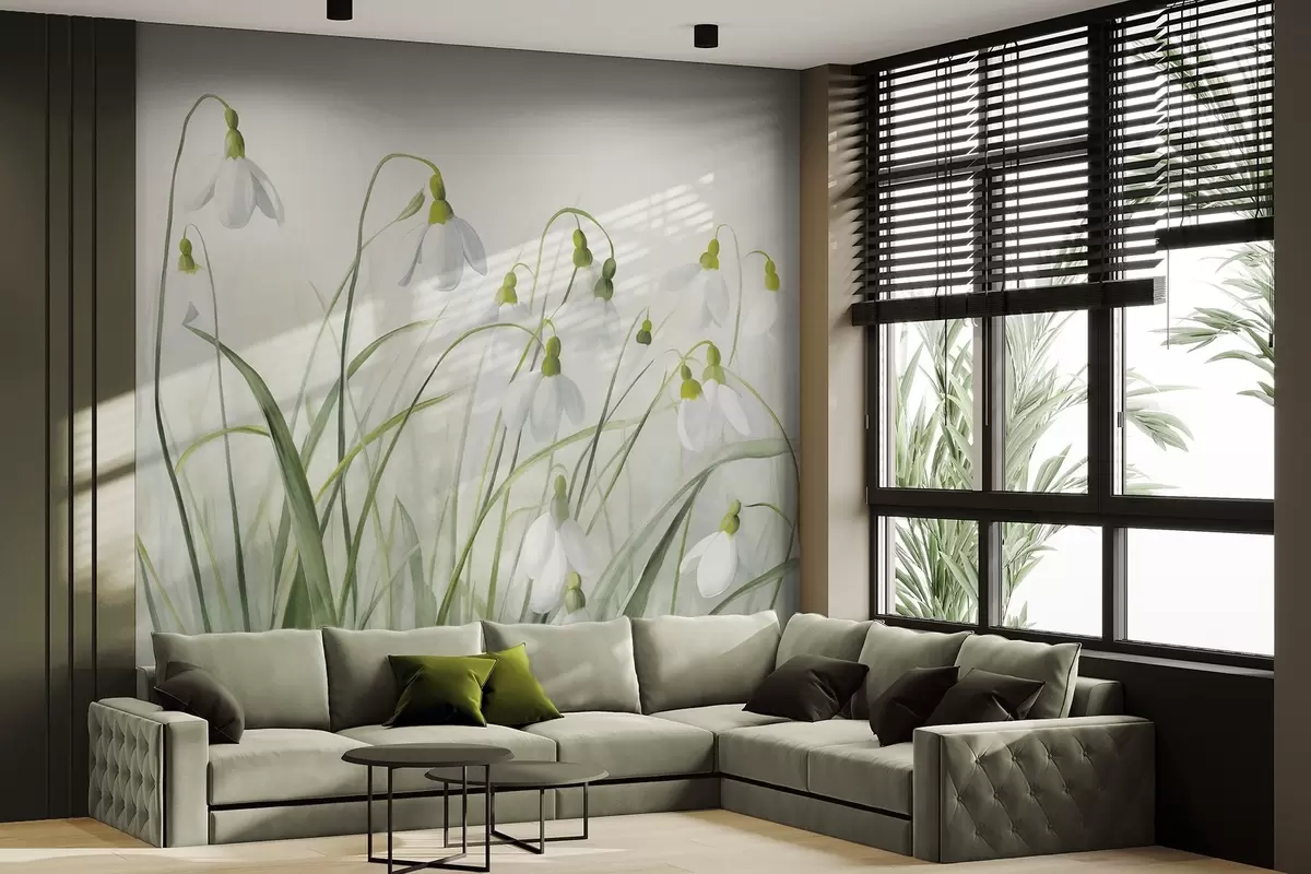 Тапете за зид Цветови висибабе са зеленим текстурираним стабљикама и листовима, акварелни пролећни стил, нежни потези четкицом бр. w09195