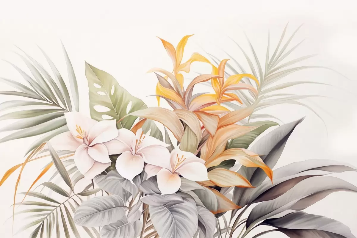 Тапете за зид Ботаничка илустрација тропског цвећа са листовима палми и монстере, меке боје, акварел стил бр. w09201