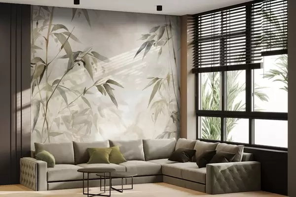 Тапете за зид Гране текстуриране бамбусом са листовима у акварел стилу, мека неутрална палета боја, светло беж позадина бр. w09204