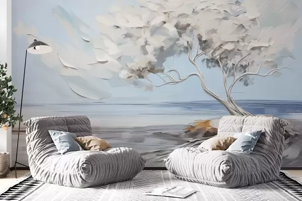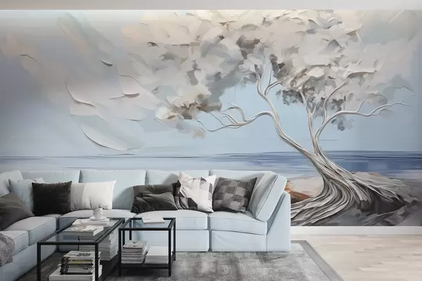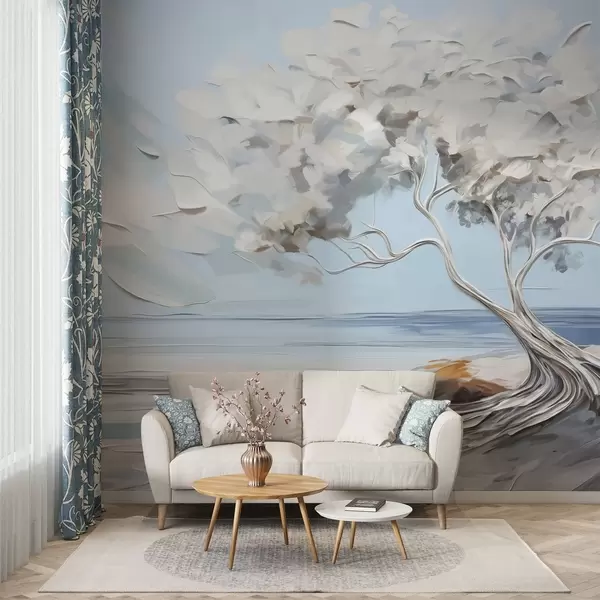 Тапете за зид Бело дрво са дебелим и текстурираним листовима на пешчаној плажи, пејзаж са светлоплавим небом бр. w09205