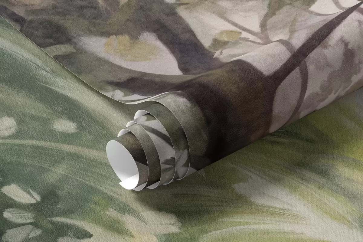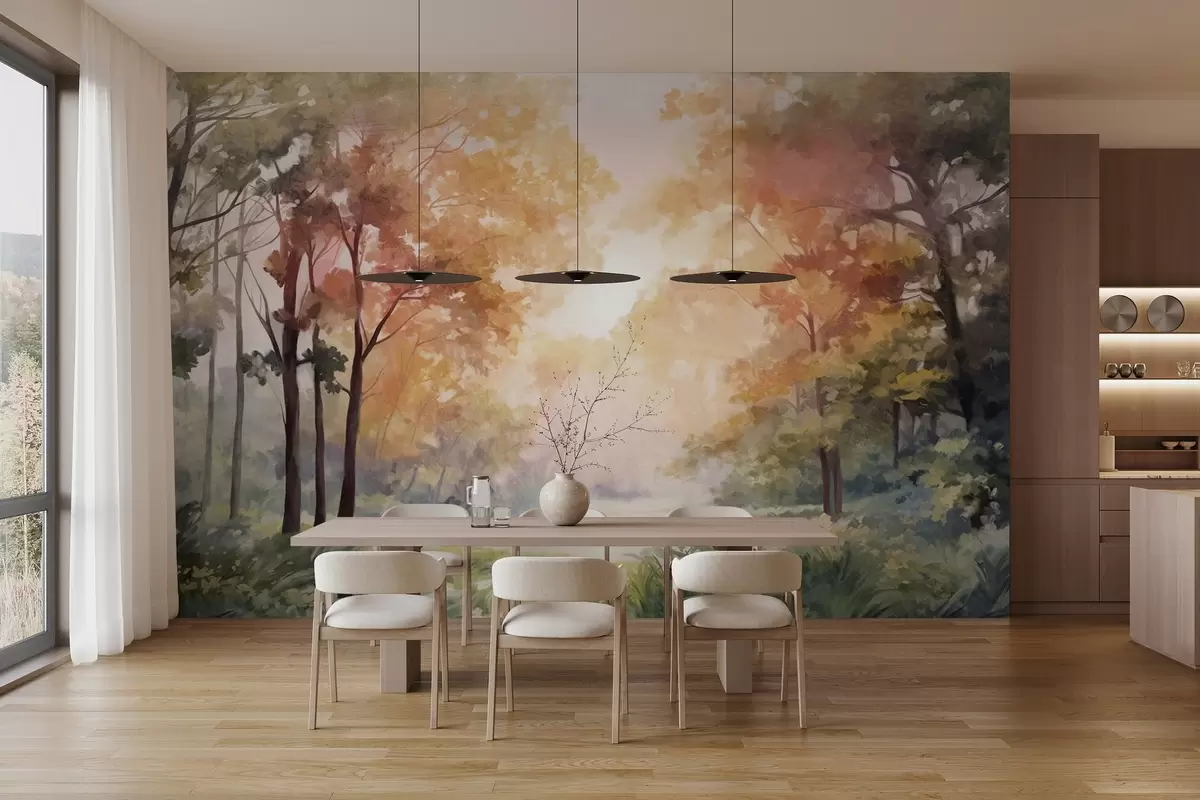 Тапете за зид Текстурирани шумски пејзаж, дрвеће са наранџастим и зеленим листовима, пастелна палета боја бр. w09210v1