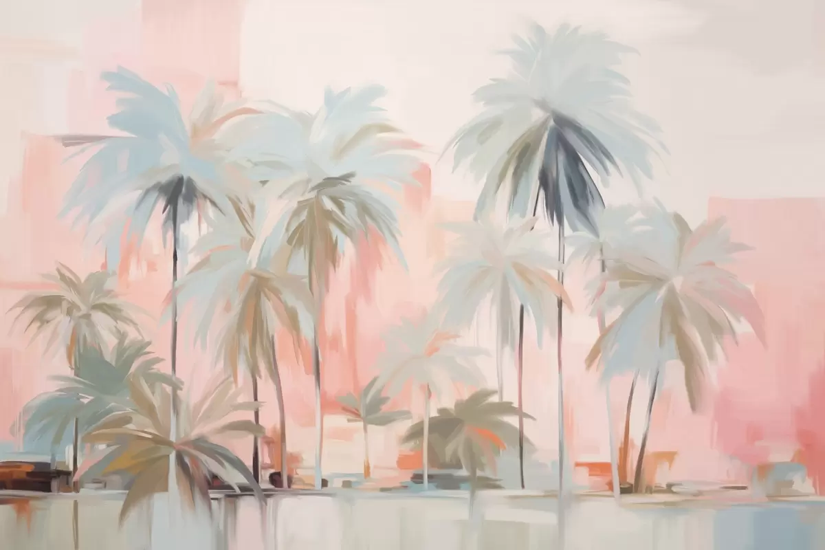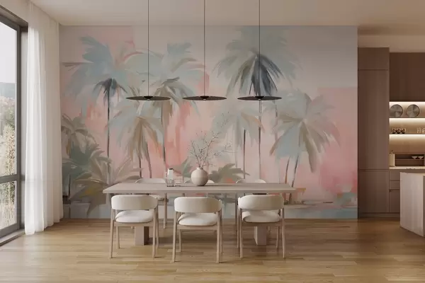 Тапете за зид Апстрактне минималистичке пастелне тропске палме, на позадини нежних ружичастих и бресквастих нијанси бр. w09212