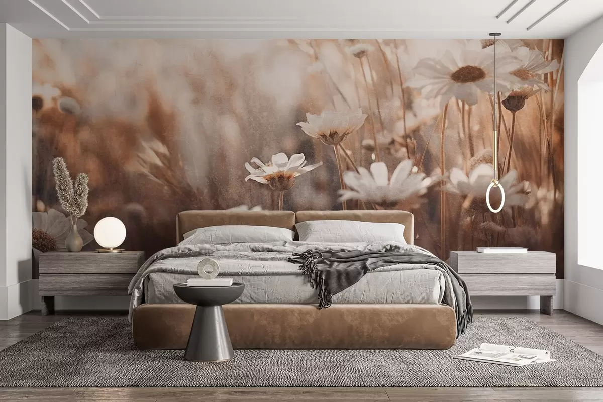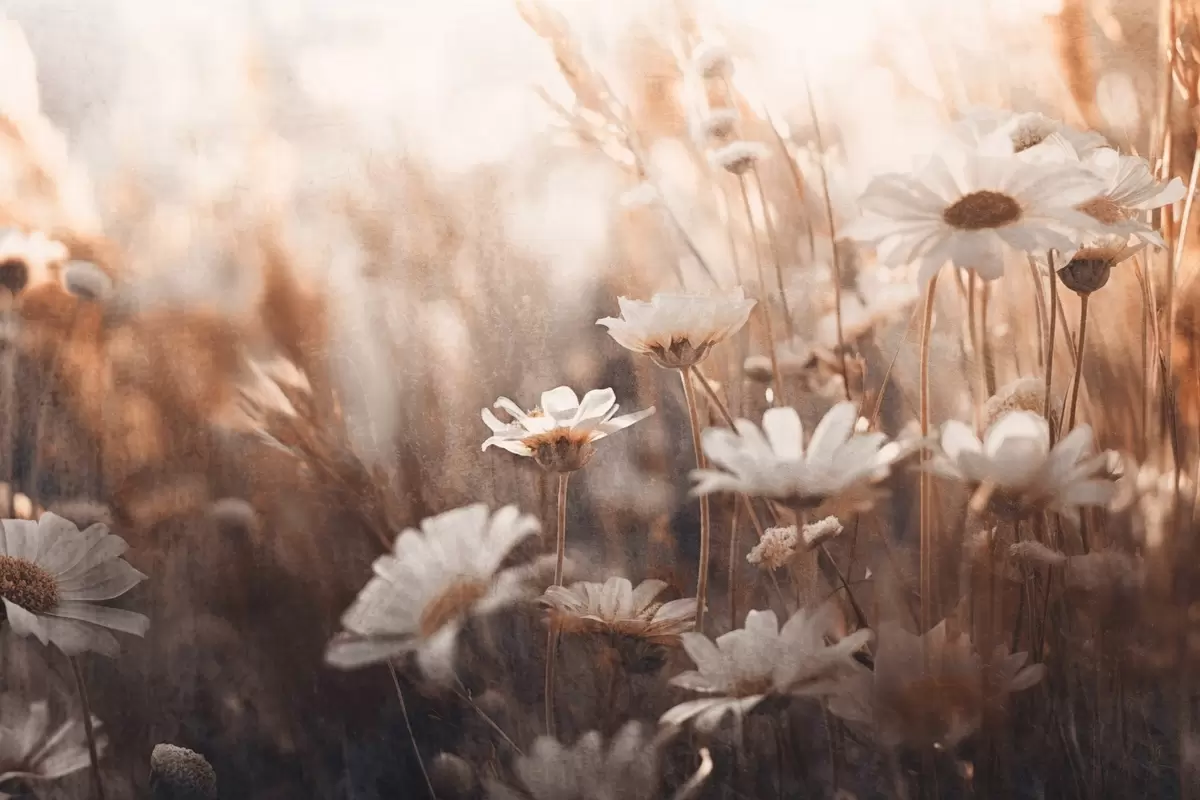 Тапете за зид Текстурирано поље белих тратинчица и дивљег цвећа у топлој палети боја са замућеном позадином бр. w09214