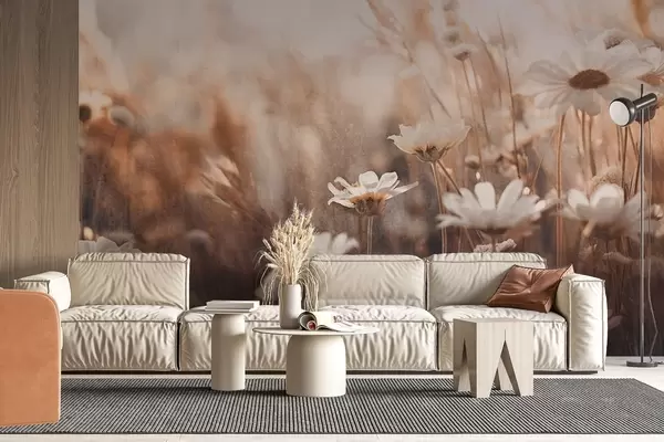 Тапете за зид Текстурирано поље белих тратинчица и дивљег цвећа у топлој палети боја са замућеном позадином бр. w09214