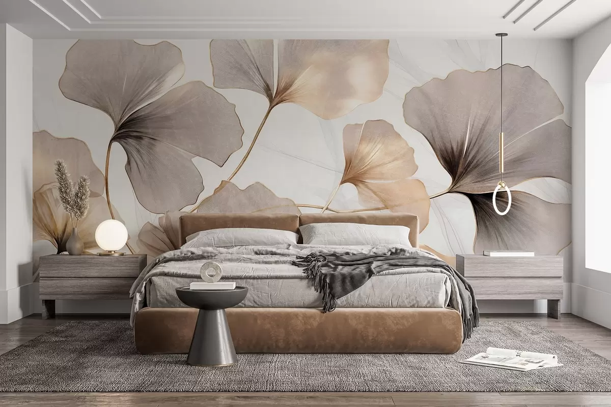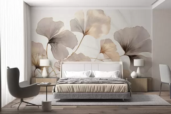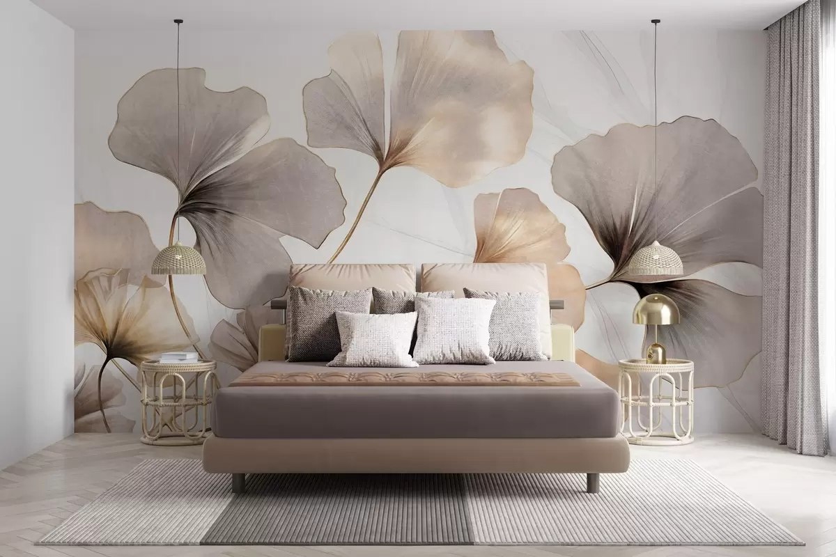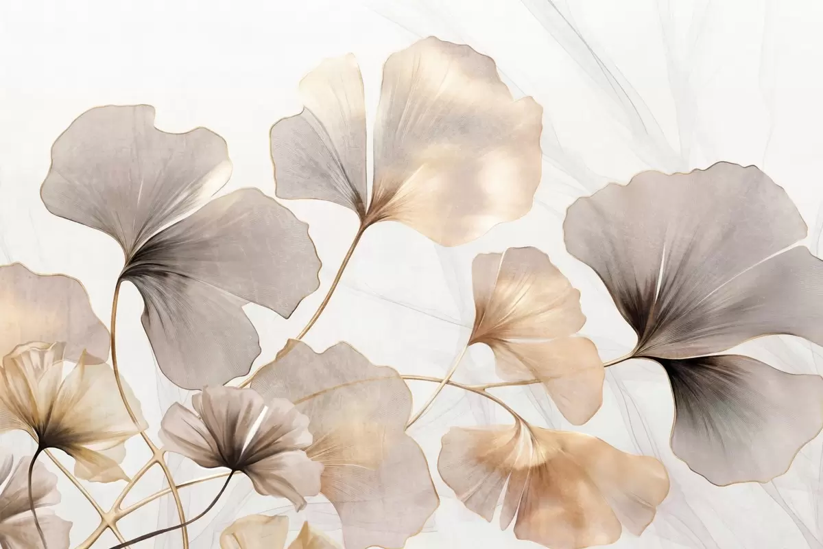 Тапете за зид Листови гинка билобе у беж, жутим и смеђим тоновима, нежни текстурирани ефекат акварела, светла позадина бр. w09215