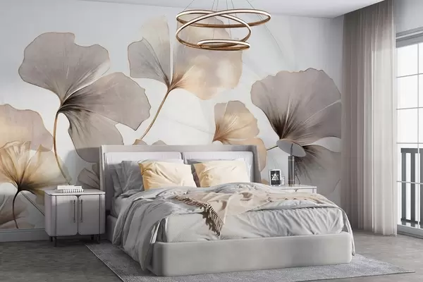Тапете за зид Листови гинка билобе у беж, жутим и смеђим тоновима, нежни текстурирани ефекат акварела, светла позадина бр. w09215