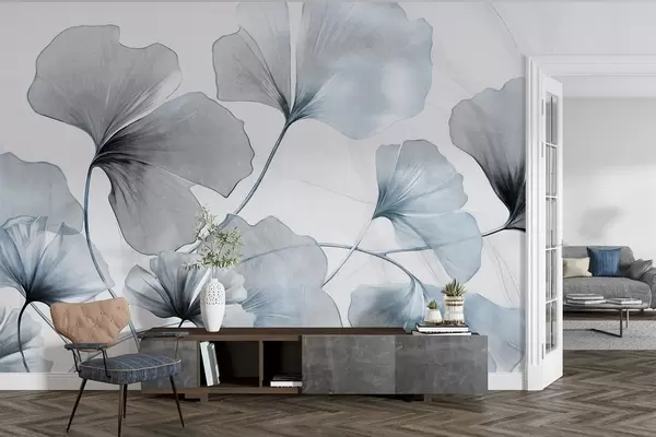 Тапете за зид Листови гинка билобе у пригушеним плавим и сивим тоновима, нежни текстурирани ефекат акварела, светла позадина бр. w09215v1