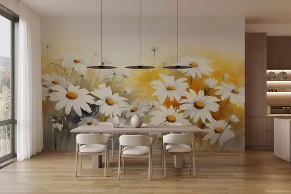 Тапете за зид Поље белих тратинчица са жутим средиштем, на мекој жутој и беж позадини, акварел стил бр. w09218