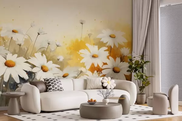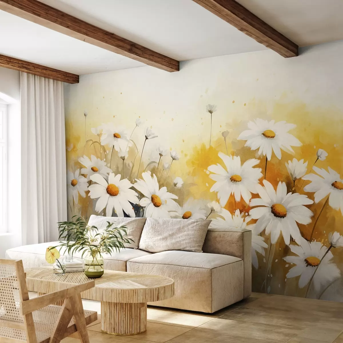 Тапете за зид Поље белих тратинчица са жутим средиштем, на мекој жутој и беж позадини, акварел стил бр. w09218