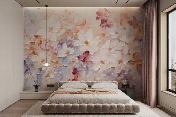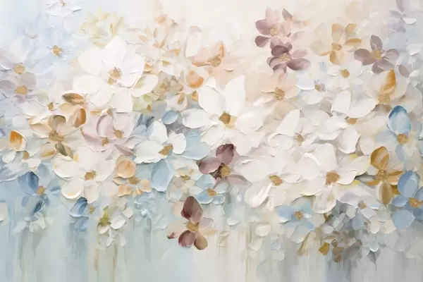 Тапете за зид Уљана слика имитација цветне баште са белим, ружичастим и наранџастим цветовима, меки потези четкицом, пастелне пригушене боје бр. w09236