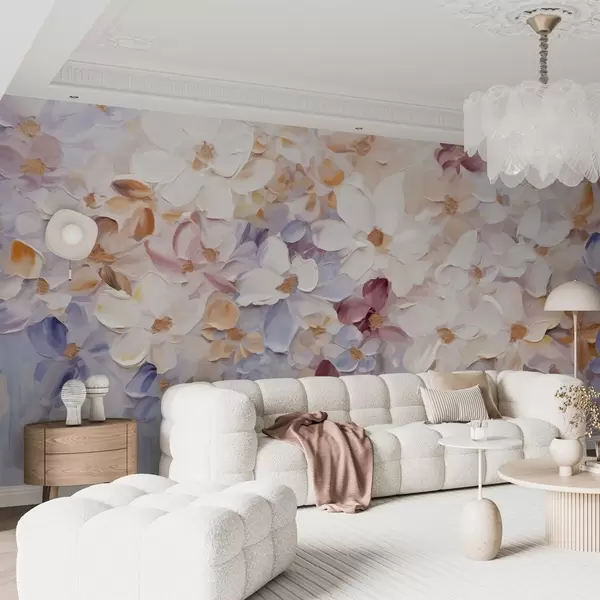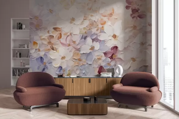Тапете за зид Уљана слика имитација цветне баште са белим, ружичастим и наранџастим цветовима, меки потези четкицом, пастелне пригушене боје бр. w09236