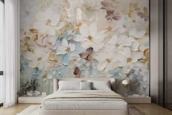 wall murals Уљана слика имитација цветне баште са белим, плавим и наранџастим цвећем, меки потези четкицом, пастелне пригушене боје w09236v1
