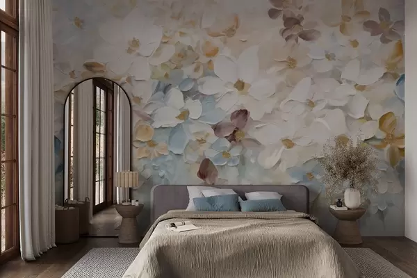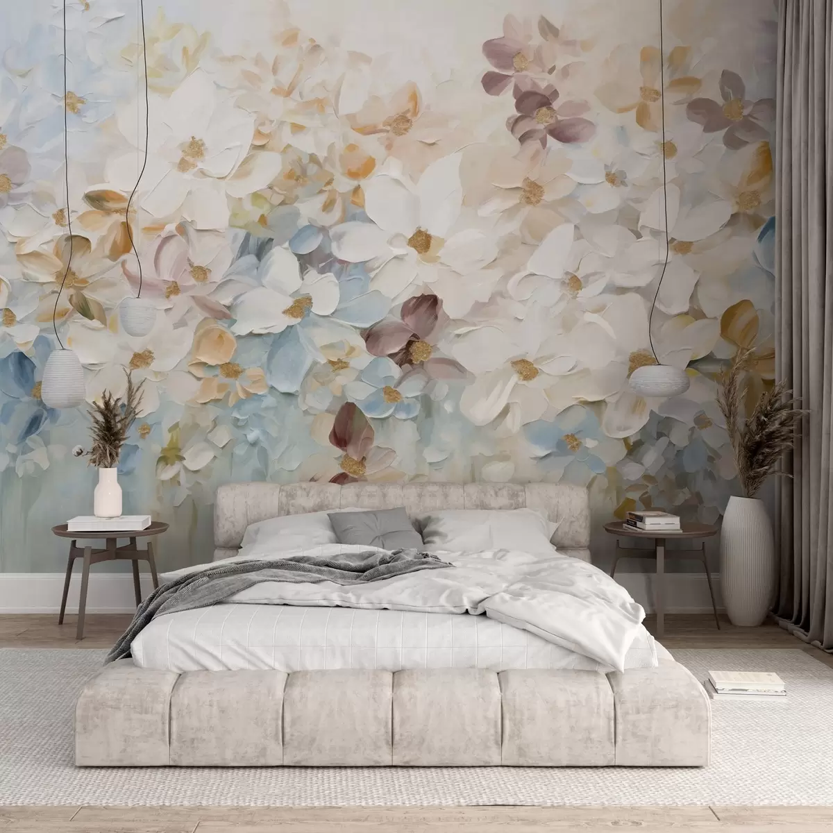 Тапете за зид Уљана слика имитација цветне баште са белим, плавим и наранџастим цвећем, меки потези четкицом, пастелне пригушене боје бр. w09236v1