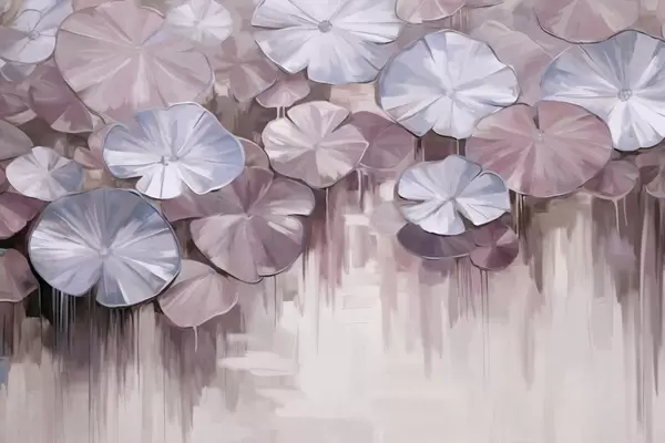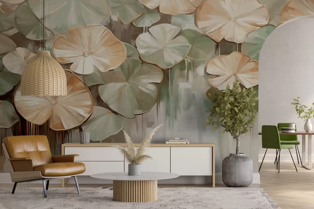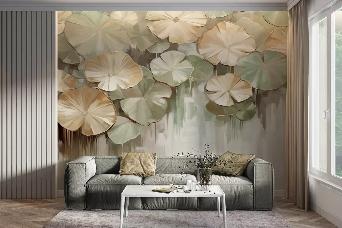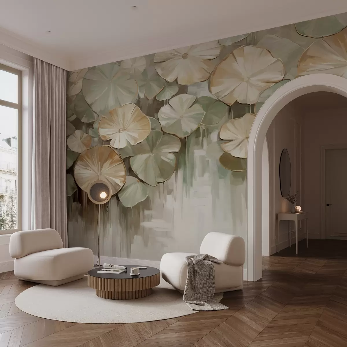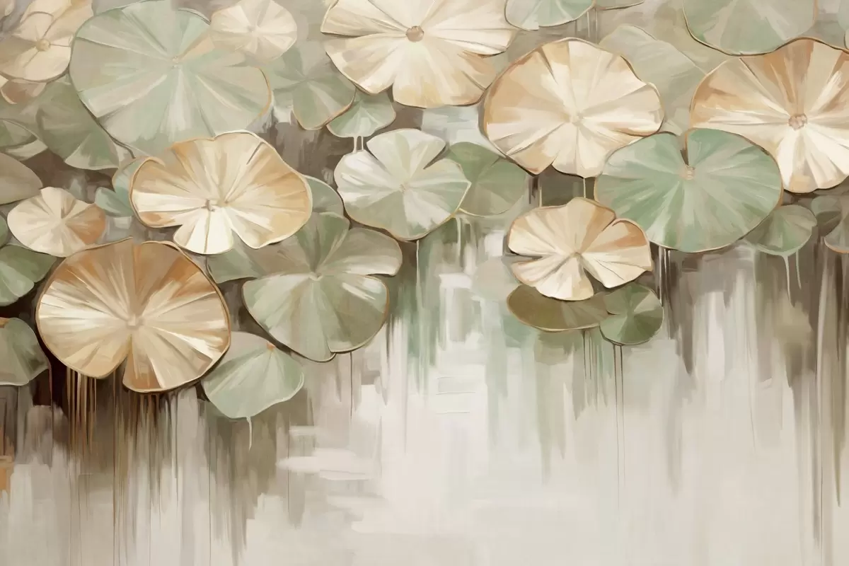 Тапете за зид Текстурирани локвини са зеленим и беж бојама у језеру, позадина је мутна мешавина беле, зелене и браон боје бр. w09255