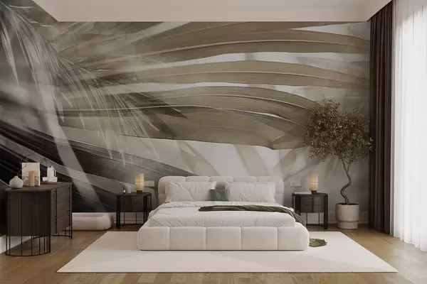 Тапете за зид Палмино лишће светло смеђе нијансе, које се преклапа и ствара слојевити ефекат, на мекој, неутралној позадини бр. w09256