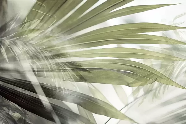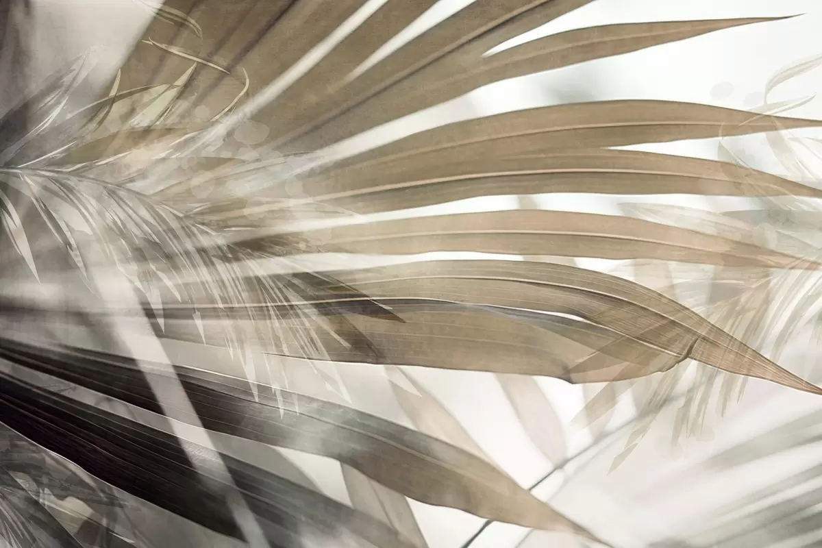 Тапете за зид Палмино лишће светло смеђе нијансе, које се преклапа и ствара слојевити ефекат, на мекој, неутралној позадини бр. w09256
