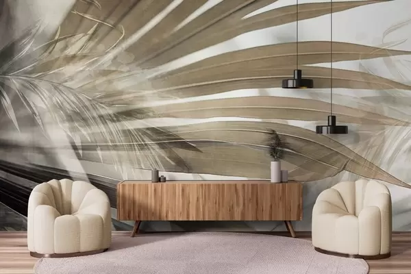 wall murals Палмино лишће светло смеђе нијансе, које се преклапа и ствара слојевити ефекат, на мекој, неутралној позадини w09256
