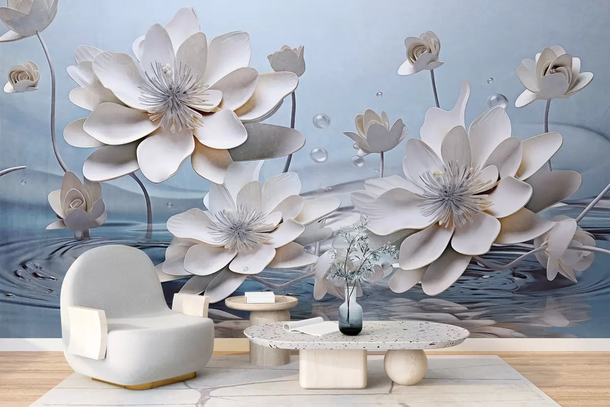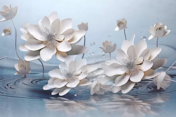 Тапете за зид Бело текстурирано цвеће са капљицама воде, одсјаји на површини воде, светлоплава позадина, елегантан дизајн бр. w09262