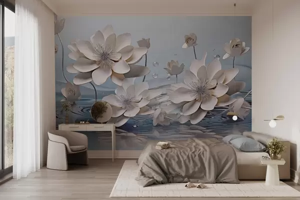 Тапете за зид Бело текстурирано цвеће са капљицама воде, одсјаји на површини воде, светлоплава позадина, елегантан дизајн бр. w09262