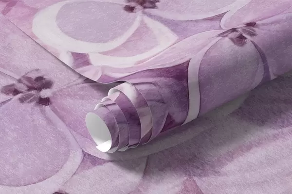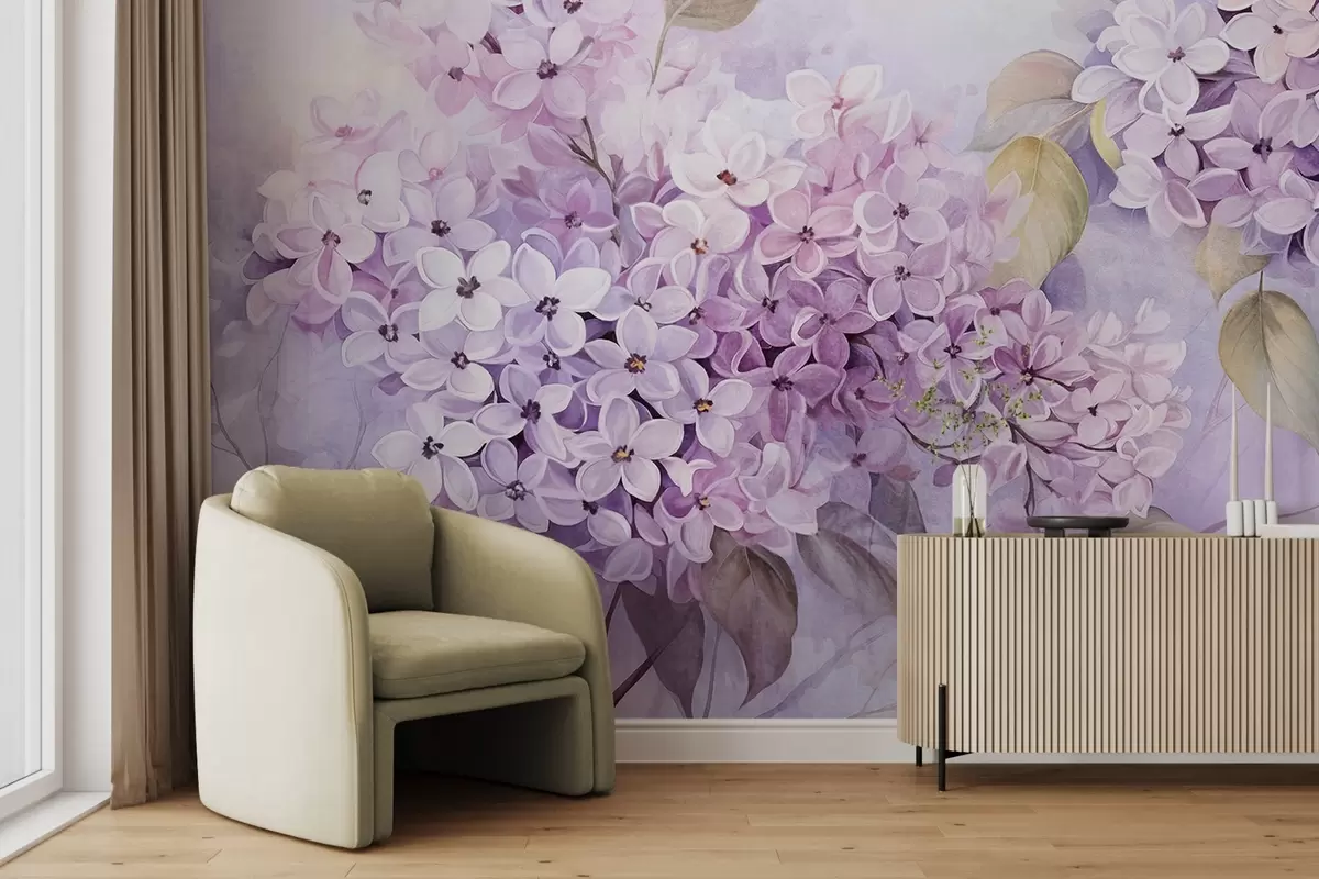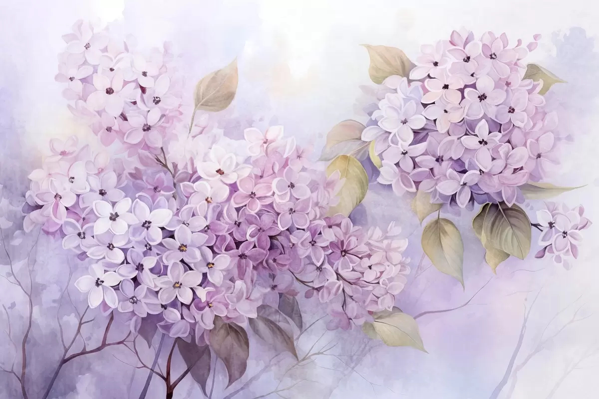 Тапете за зид Лила текстурирано цвеће са светло љубичастим латицама, светло зеленим листовима, акварел стил, меке, пастелне боје, нежни потези четкицом бр. w09291