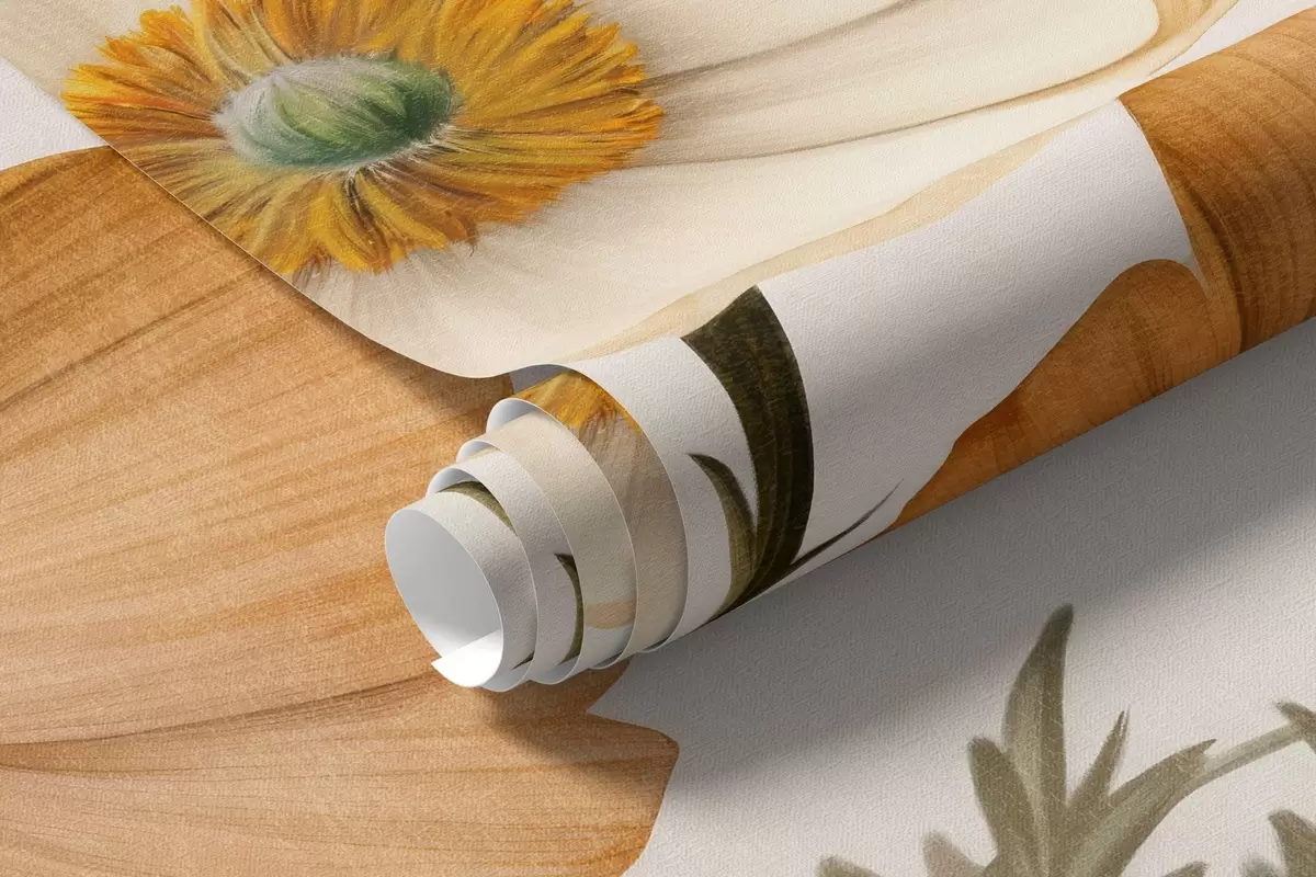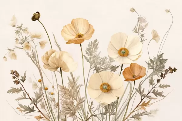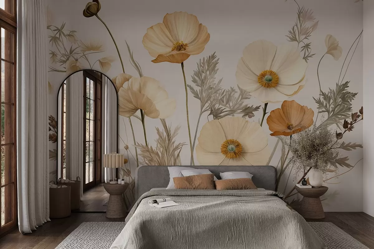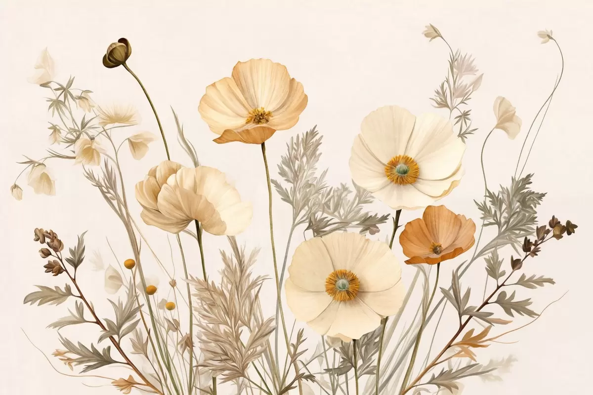 Тапете за зид Наранџасти и бели винтаге текстурирани макови са танким стабљикама и листовима, светло беж позадина, акварел стил бр. w09293