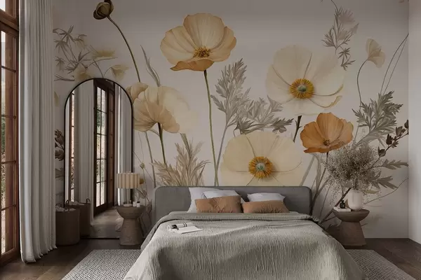 Тапете за зид Наранџасти и бели винтаге текстурирани макови са танким стабљикама и листовима, светло беж позадина, акварел стил бр. w09293