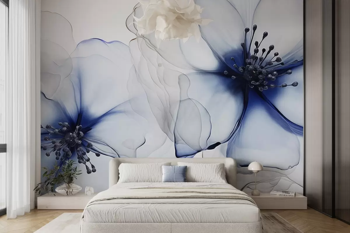 Тапете за зид Два провидна текстурирана плава цвета са видљивим прашницима, преклапајућим нежним латицама и меком, течном текстуром бр. w09295v1