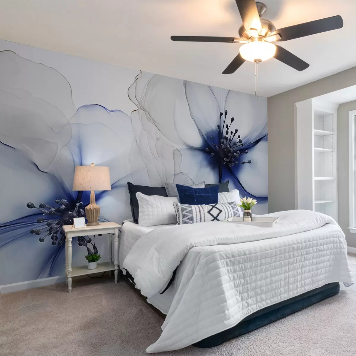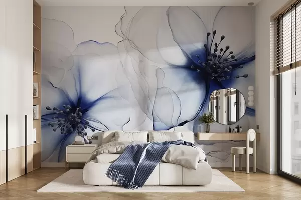 Тапете за зид Два провидна текстурирана плава цвета са видљивим прашницима, преклапајућим нежним латицама и меком, течном текстуром бр. w09295v1