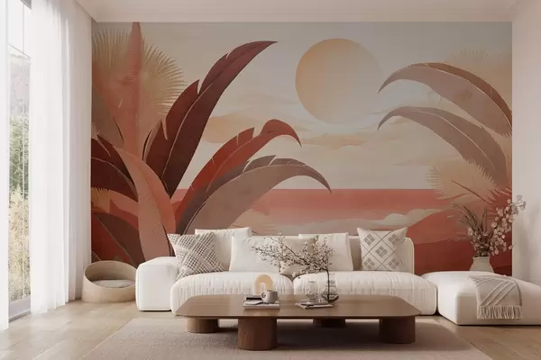 Тапете за зид Тропски текстурирани апстрактни пејзаж са палминим листовима и великим сунцем на небу, топла палета боја, минималистички стил, стилизован бр. w09296