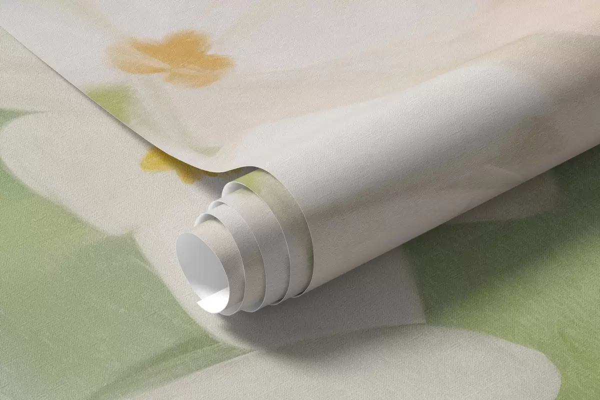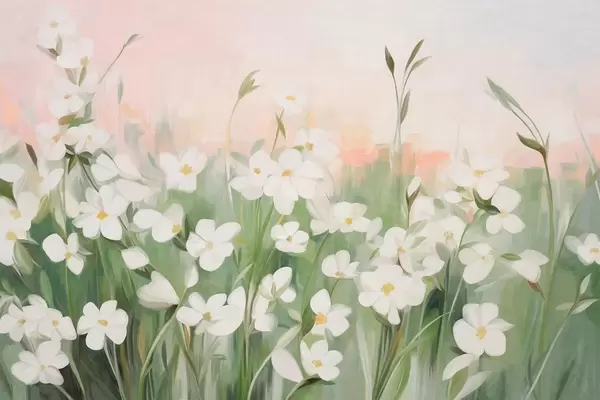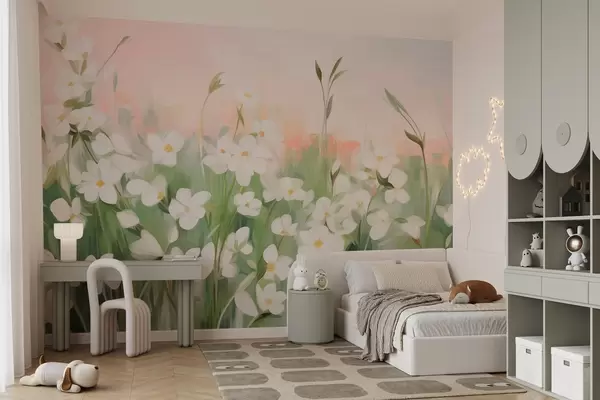Тапете за зид Апстрактно поље дивљег цвећа са зеленим стабљикама и листовима, наспрам нежно ружичастог и белог текстурираног неба бр. w09297
