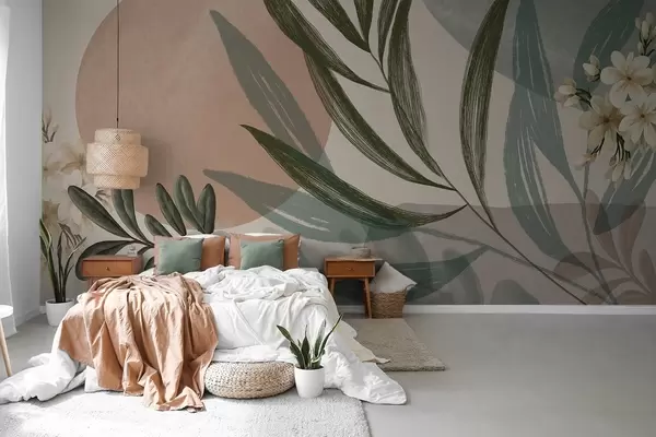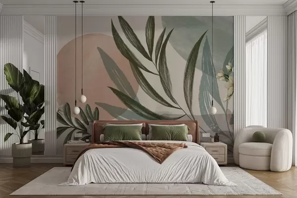 Тапете за зид Апстрактна ботаничка уметност са зеленим палминим листовима и белим бобицама, на позадини облика у пригушеним земљаним тоновима бр. w09312