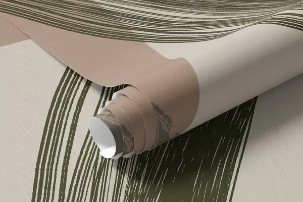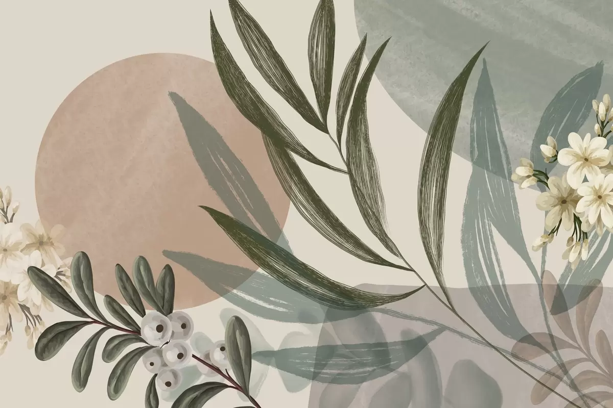 Тапете за зид Апстрактна ботаничка уметност са зеленим палминим листовима и белим бобицама, на позадини облика у пригушеним земљаним тоновима бр. w09312