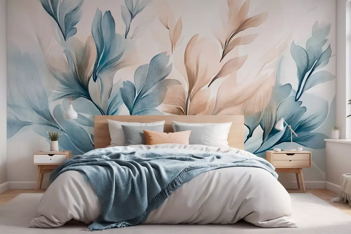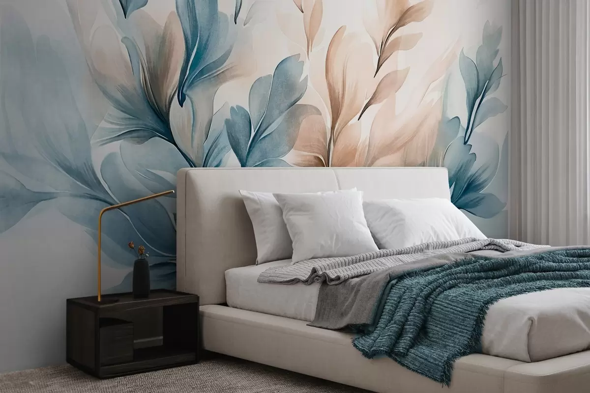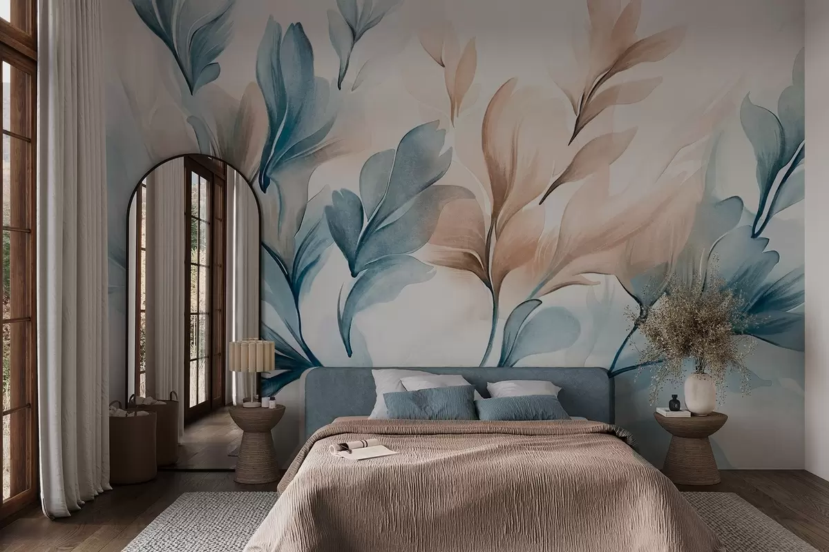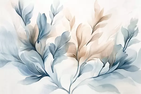 Тапете за зид Плаво и смеђе апстрактно лишће са видљивим потезима четкице, светло и текстурирано, мека палета боја, ефекат акварела бр. w09313