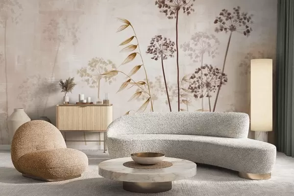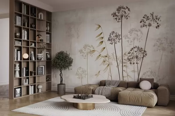 Тапете за зид Цртеж сушеног цвећа са дугим стабљикама, монохроматска палета, на текстурираној, светло беж позадини, ботаничка илустрација бр. w09314v1