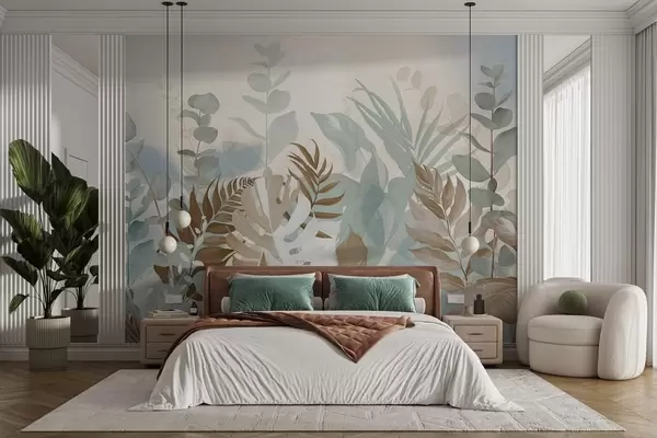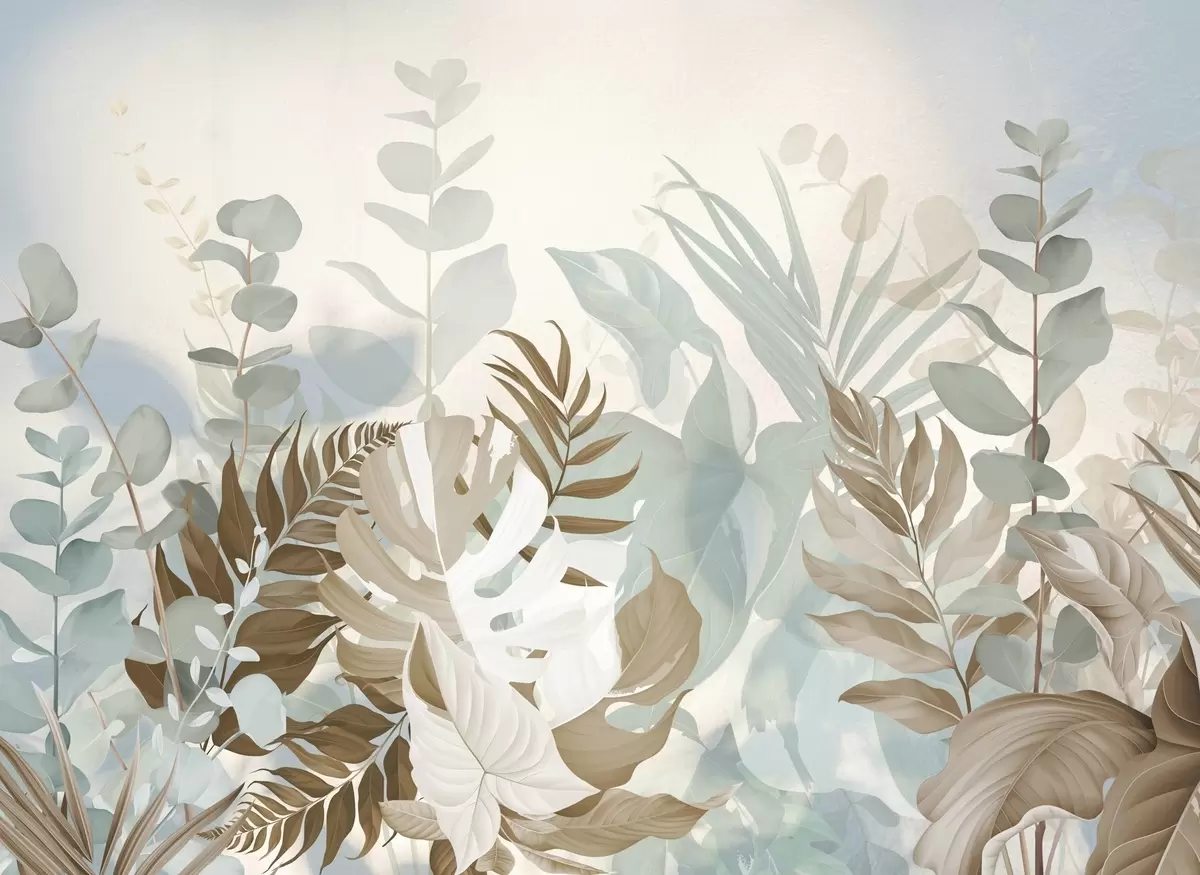 Тапете за зид Пастелне биљке папрати, монстера и еукалиптус, светла текстурирана позадина, меко осветљење, мирно, ботаничка илустрација бр. w09316v1