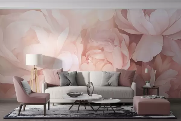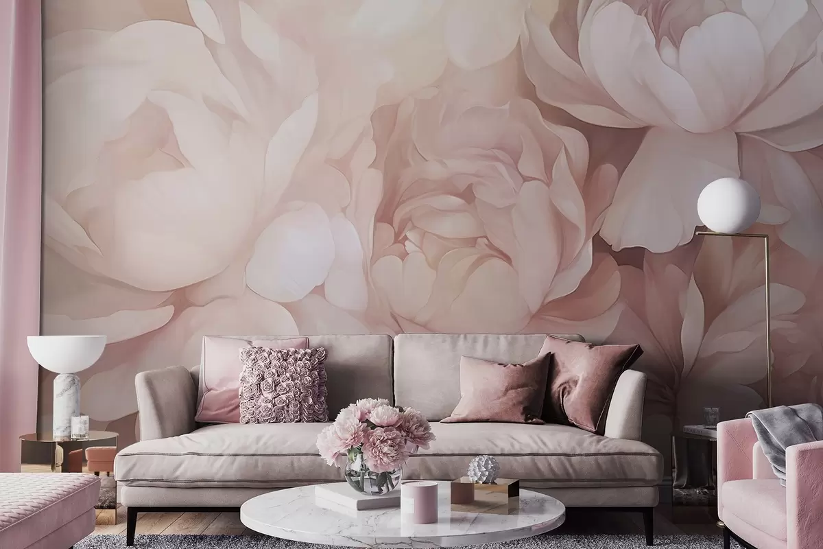 Тапете за зид Светло пастелно ружичасти божури са меким, текстурираним, нежним латицама, уско распоређени, стварајући густу цветну уметност, меко осветљење бр. w09319