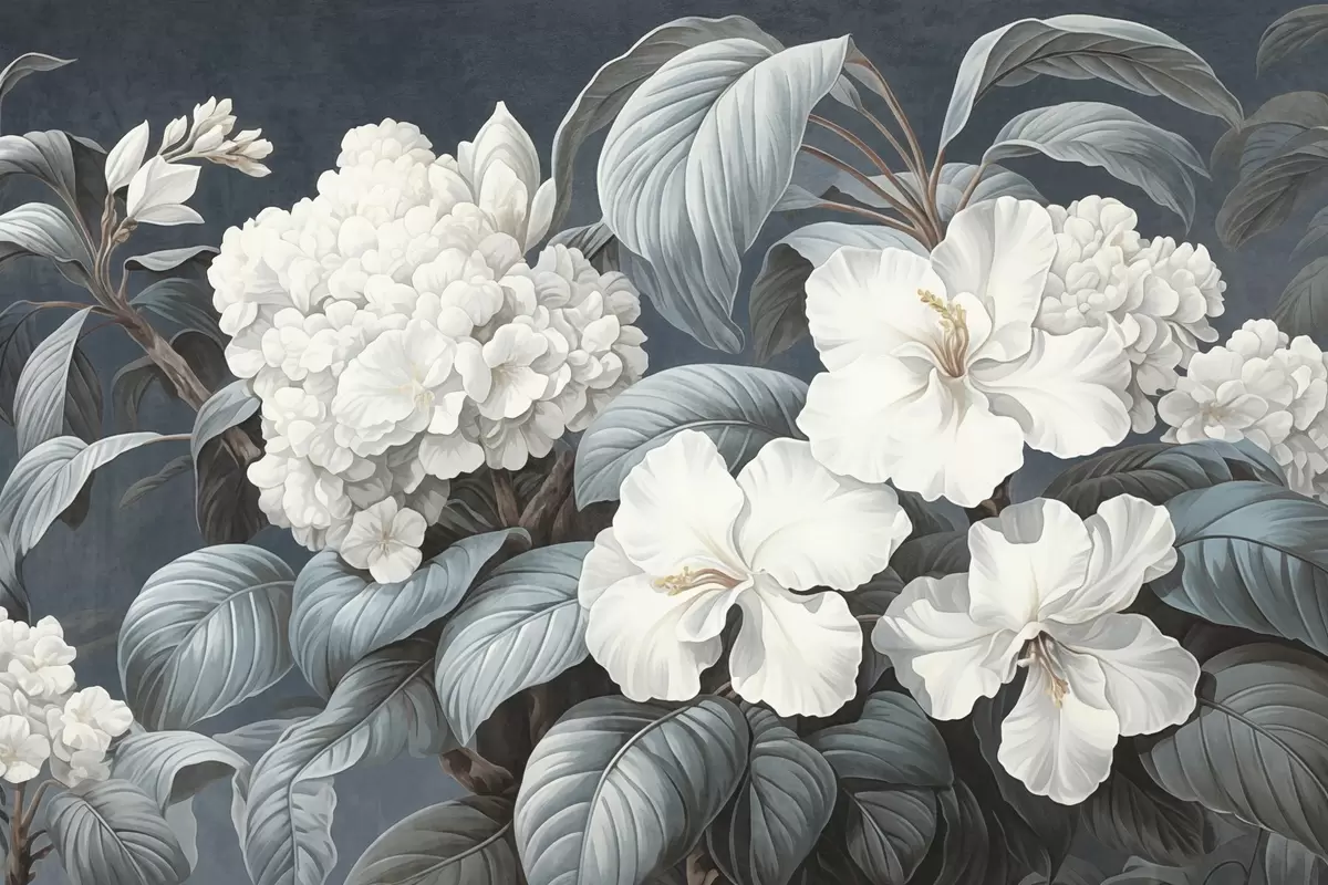 Тапете за зид Бело тропско цвеће са нежним латицама и листовима у тамноплавој позадини, винтаге текстурирани стил, ботаничка илустрација бр. w09334
