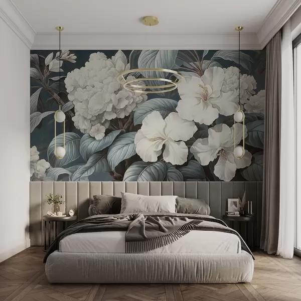 Тапете за зид Бело тропско цвеће са нежним латицама и листовима у тамноплавој позадини, винтаге текстурирани стил, ботаничка илустрација бр. w09334