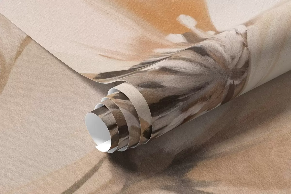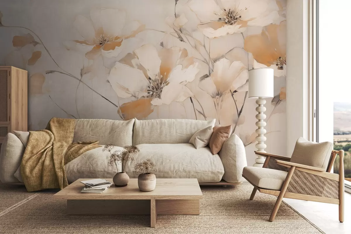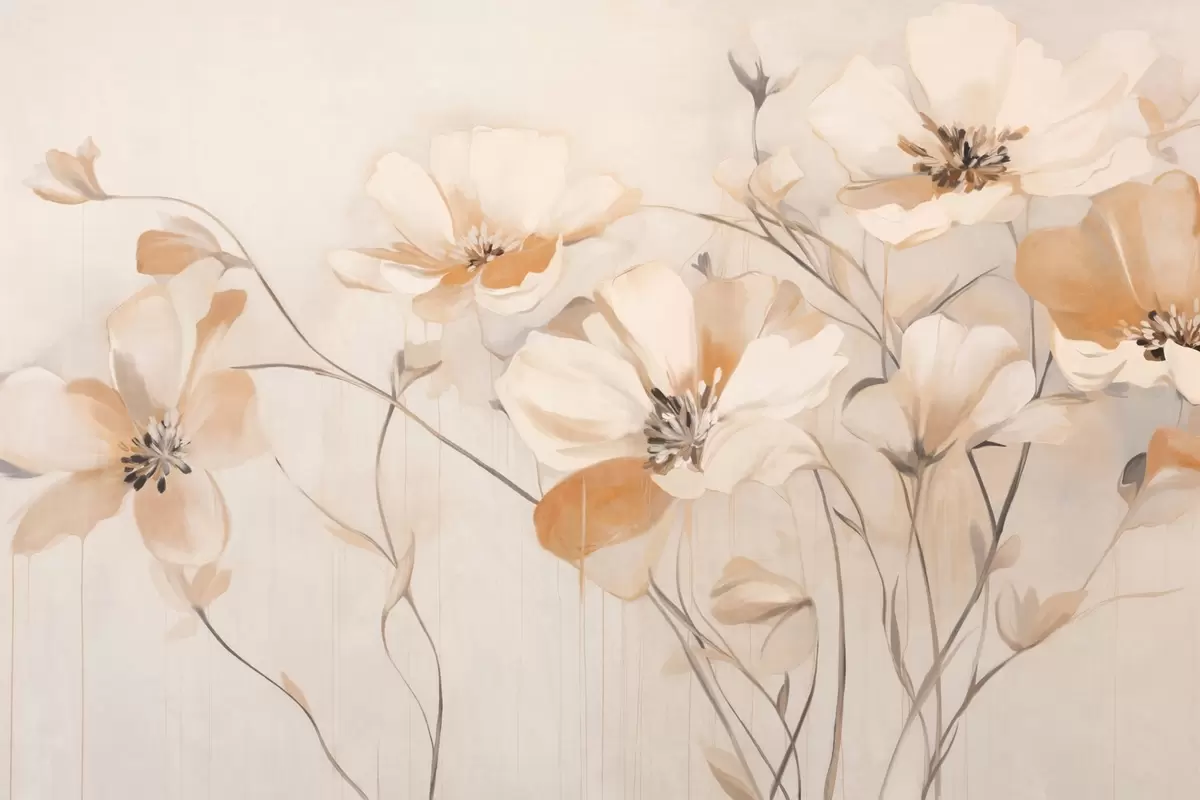 Тапете за зид Бело и наранџасто текстурирано цвеће са дугим стабљикама, светла позадина, меке боје, елегантна композиција, нежни потези четкицом бр. w09335