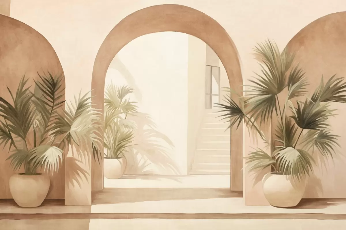 Тапете за зид Текстурирани лукови са саксијским биљкама, светло беж палета боја, минималистички дизајн, степениште у позадини бр. w09339