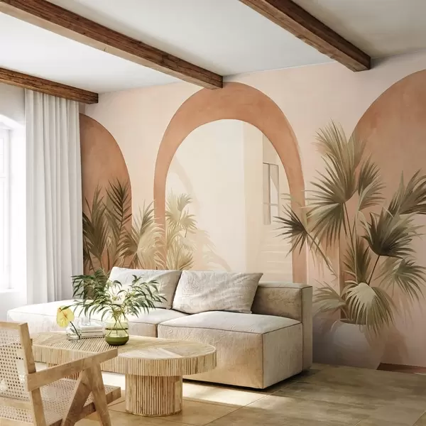 wall murals Текстурирани лукови са саксијским биљкама, светло беж палета боја, минималистички дизајн, степениште у позадини w09339