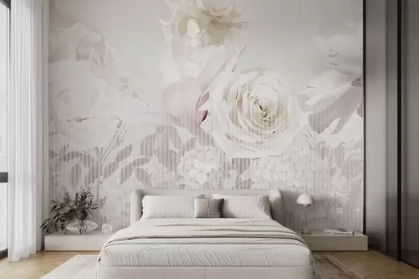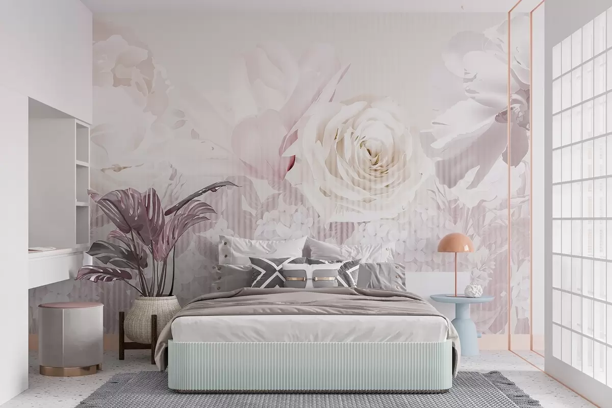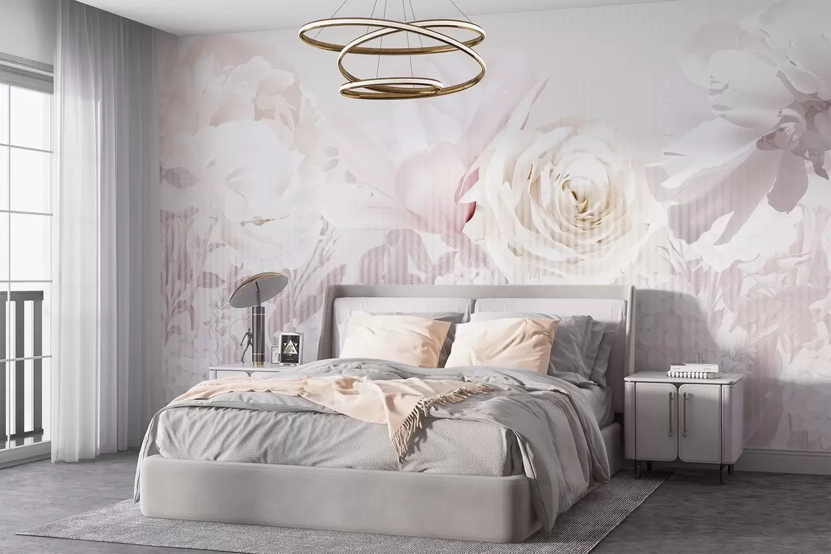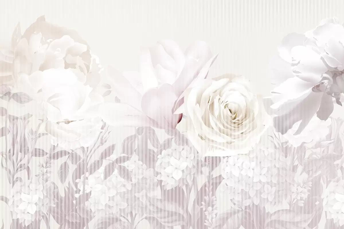 Тапете за зид Цветни аранжман са ружама, хортензијама и тулипанима у нежним пастелним нијансама беле, ружичасте и беж боје, са пругастом текстуром бр. w09340