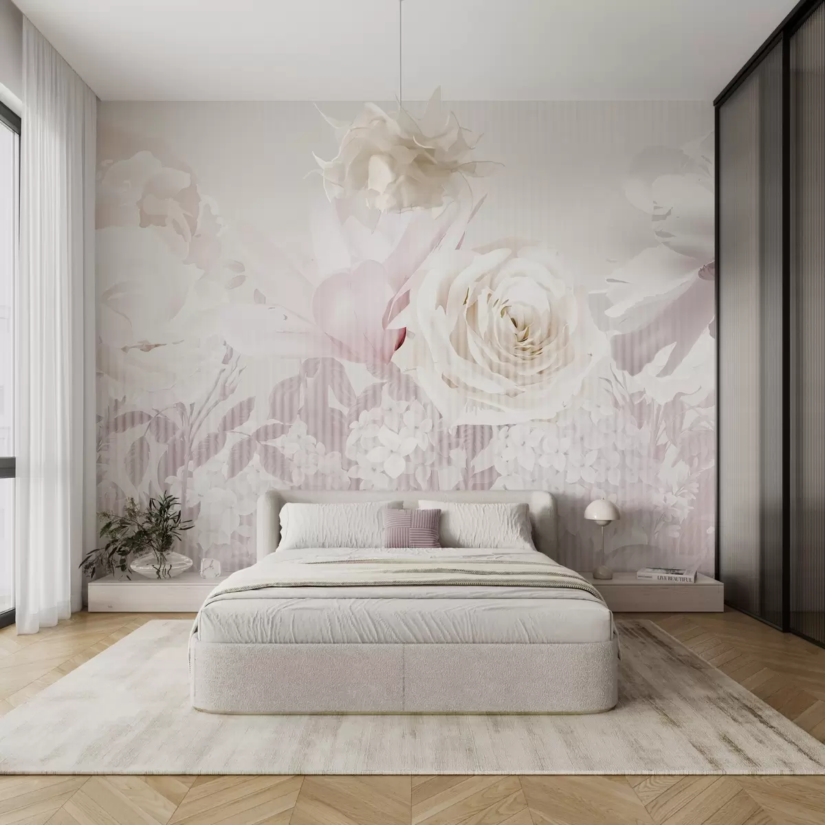 Тапете за зид Цветни аранжман са ружама, хортензијама и тулипанима у нежним пастелним нијансама беле, ружичасте и беж боје, са пругастом текстуром бр. w09340