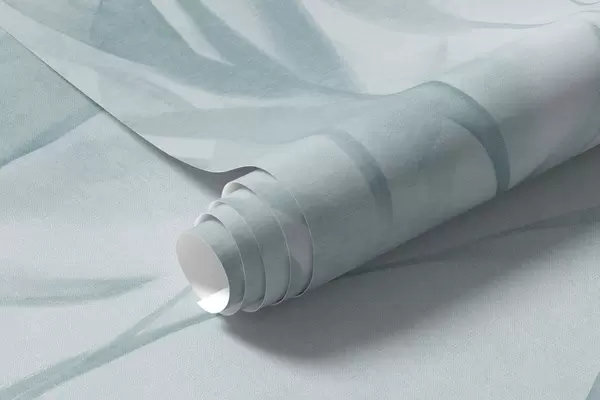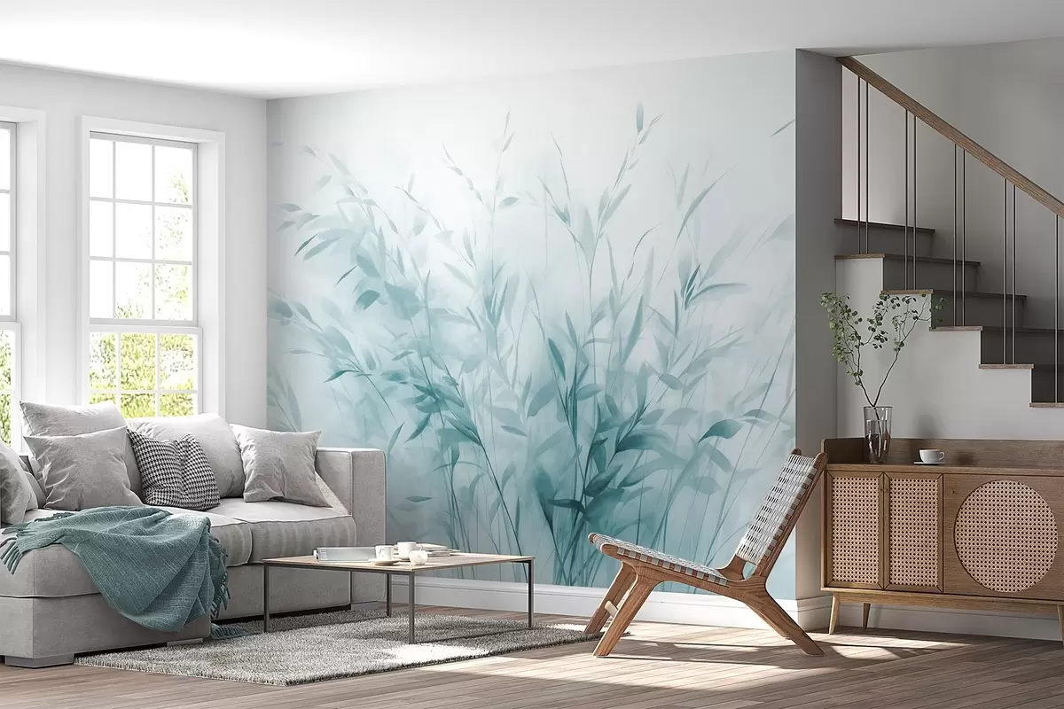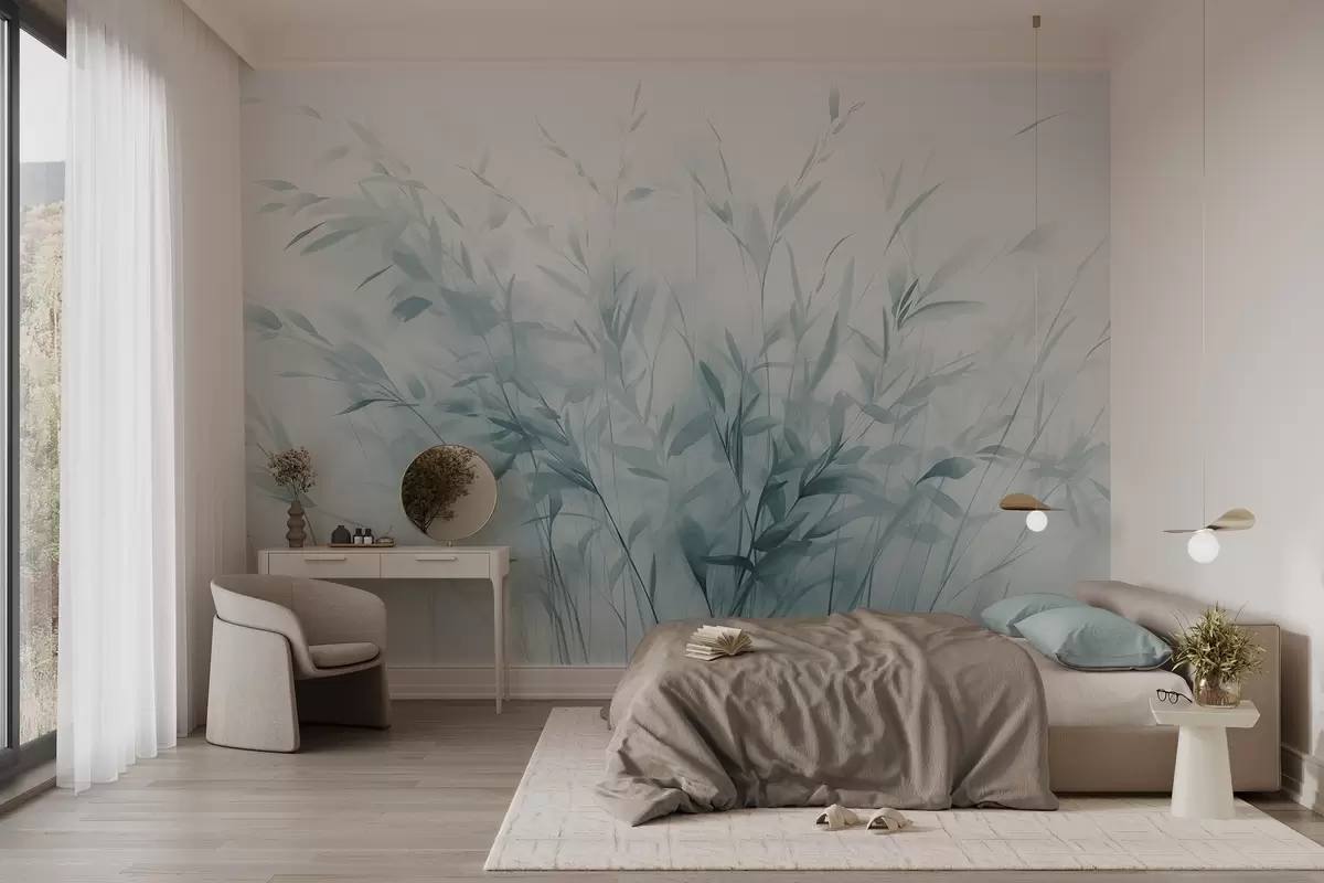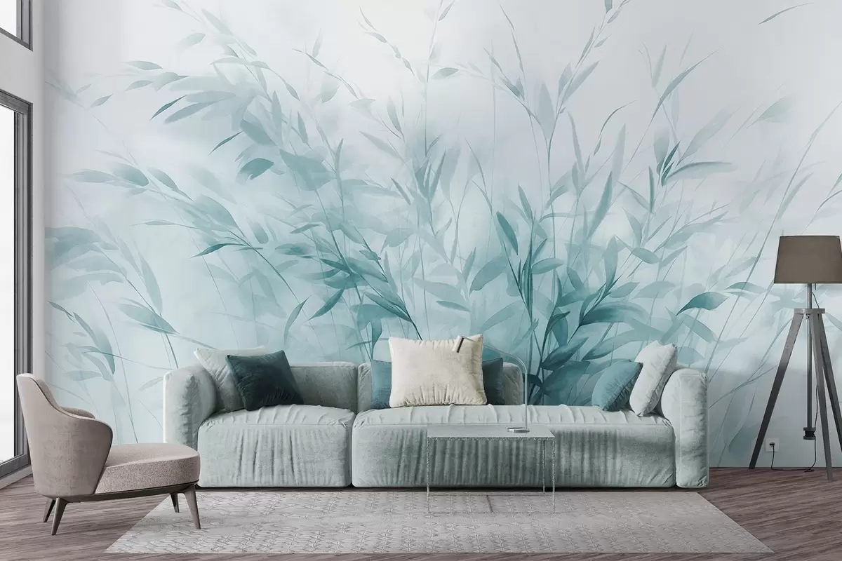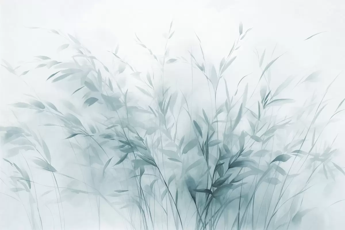 Тапете за зид Трава и коров са танким листовима и стабљикама, светлоплаве боје, меки и нежни потези четкицом, минималистички отисак бр. w09342v1