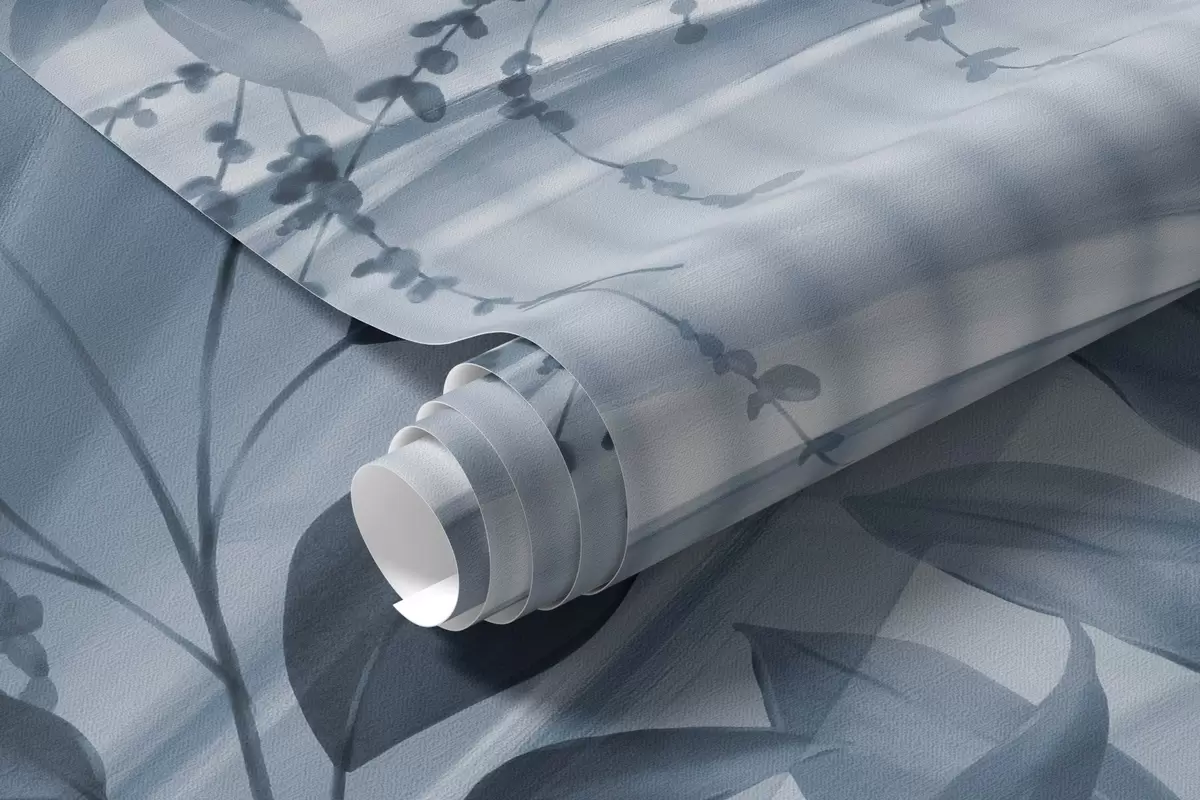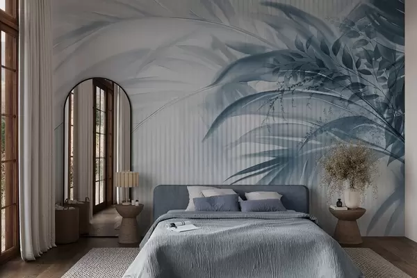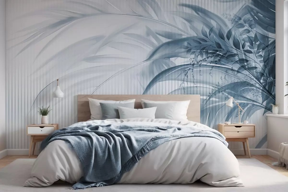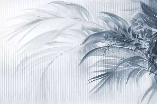 Тапете за зид Палмино тропско плаво лишће са белом пругастом позадином, меко осветљење, нежни потези четкицом, органски облици бр. w09343v1